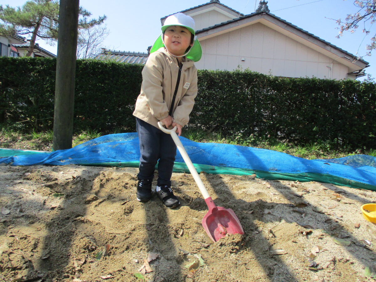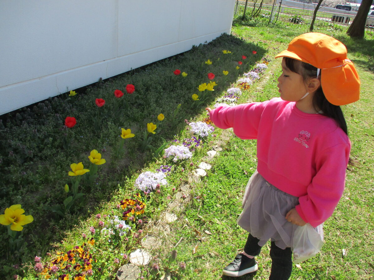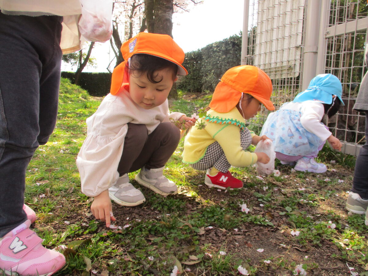 園庭では砂遊びをしたり、追いかけっこをしたり、綺麗な桜が舞っていると「きれ~い!」と言いながらキャッチをしようとしたり、落ちている桜の花びらを袋に集めている子もいます!