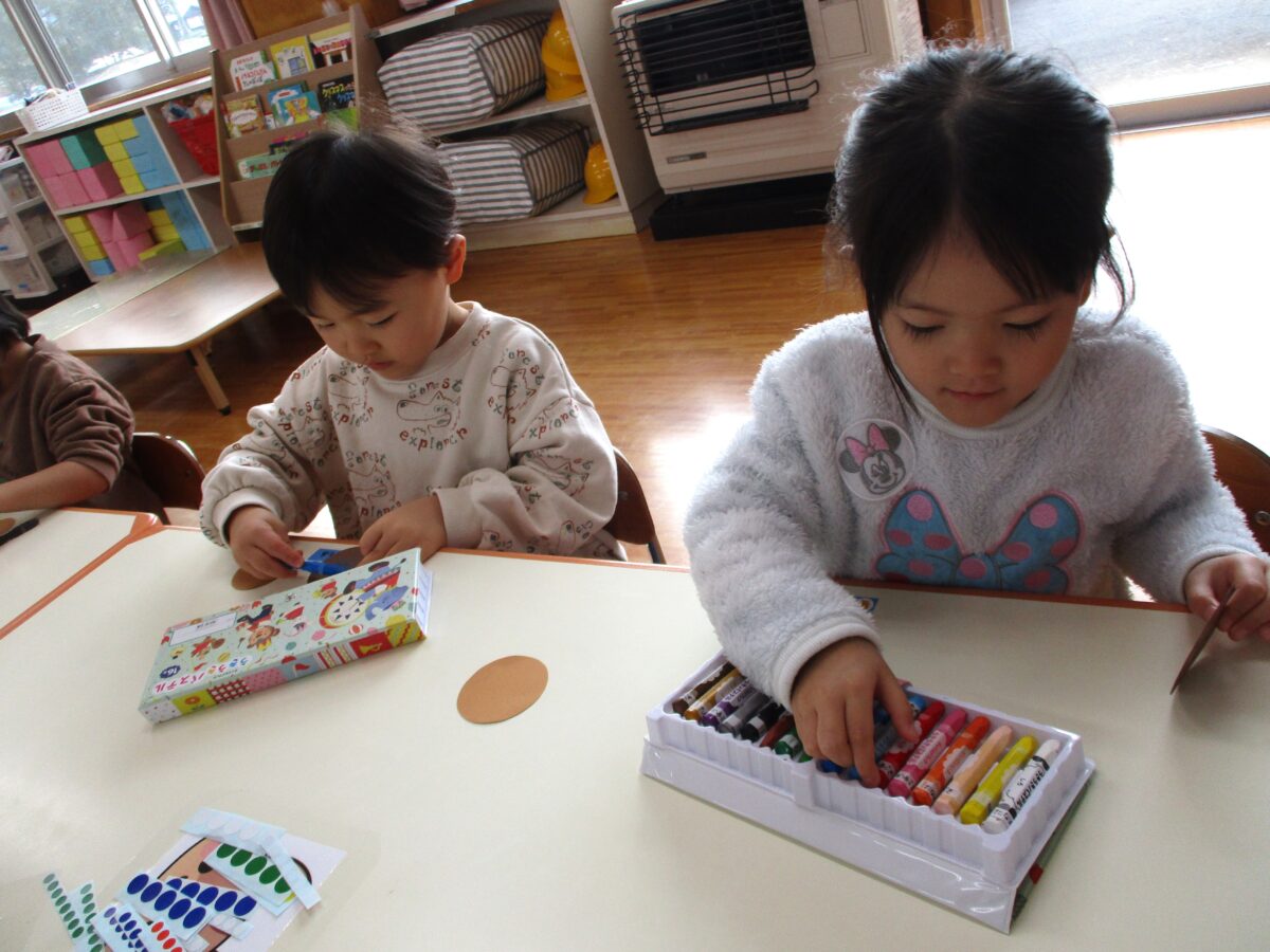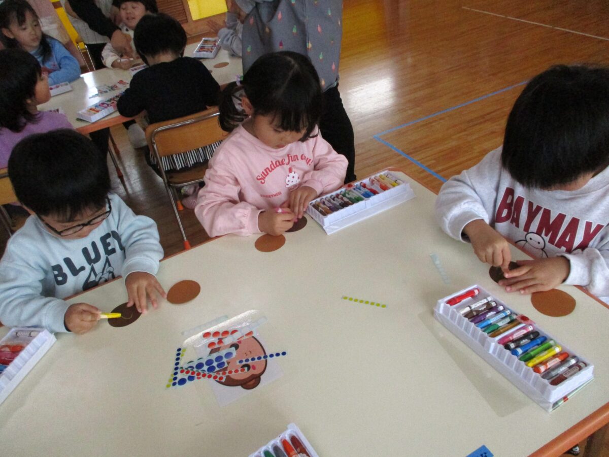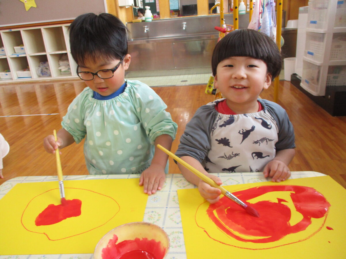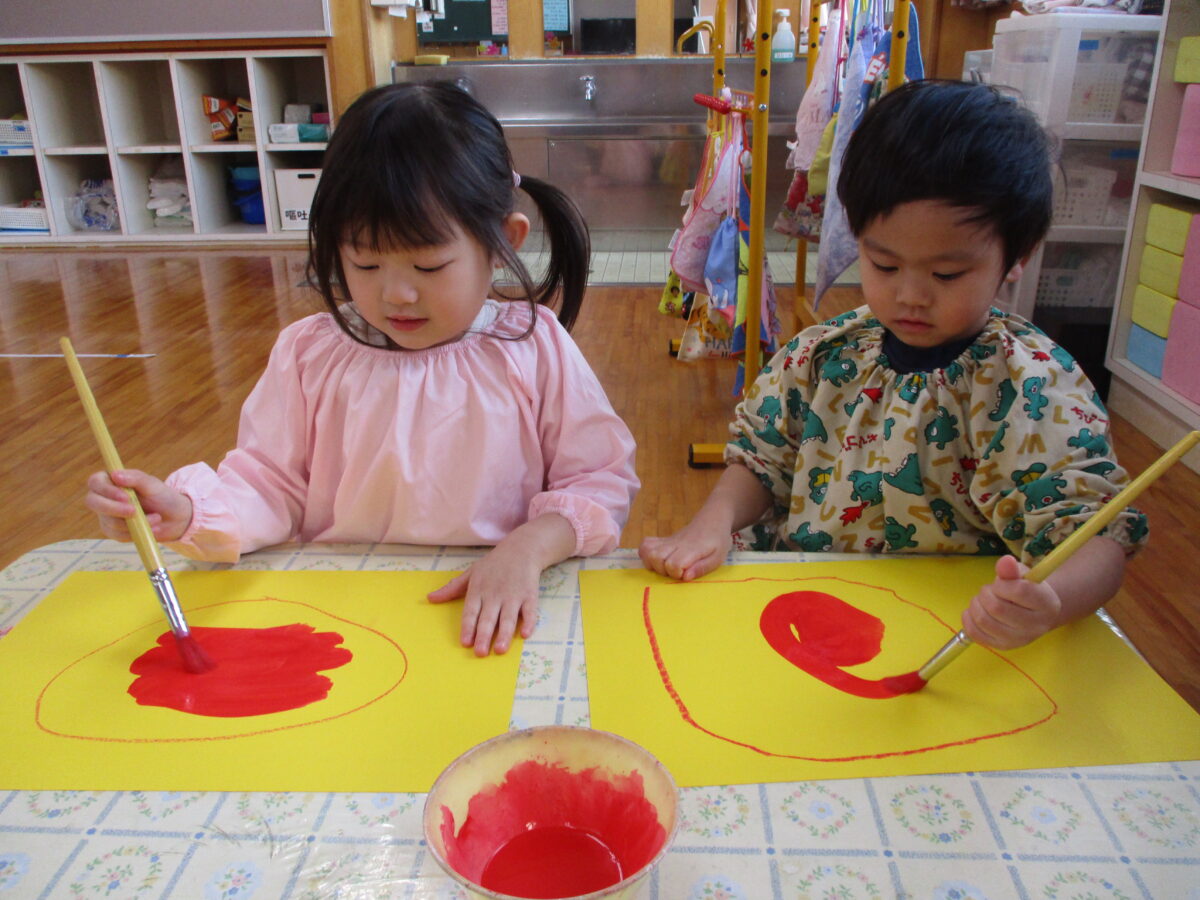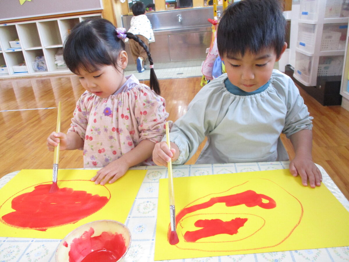 だるまの製作をしました。クレヨンでだるまの体を描いたところに赤い絵の具で色を付けました。筆にたっぷりと絵の具を付けて、慎重に筆を動かしたりダイナミックに塗ってみたりと思い思いに楽しんでいました。