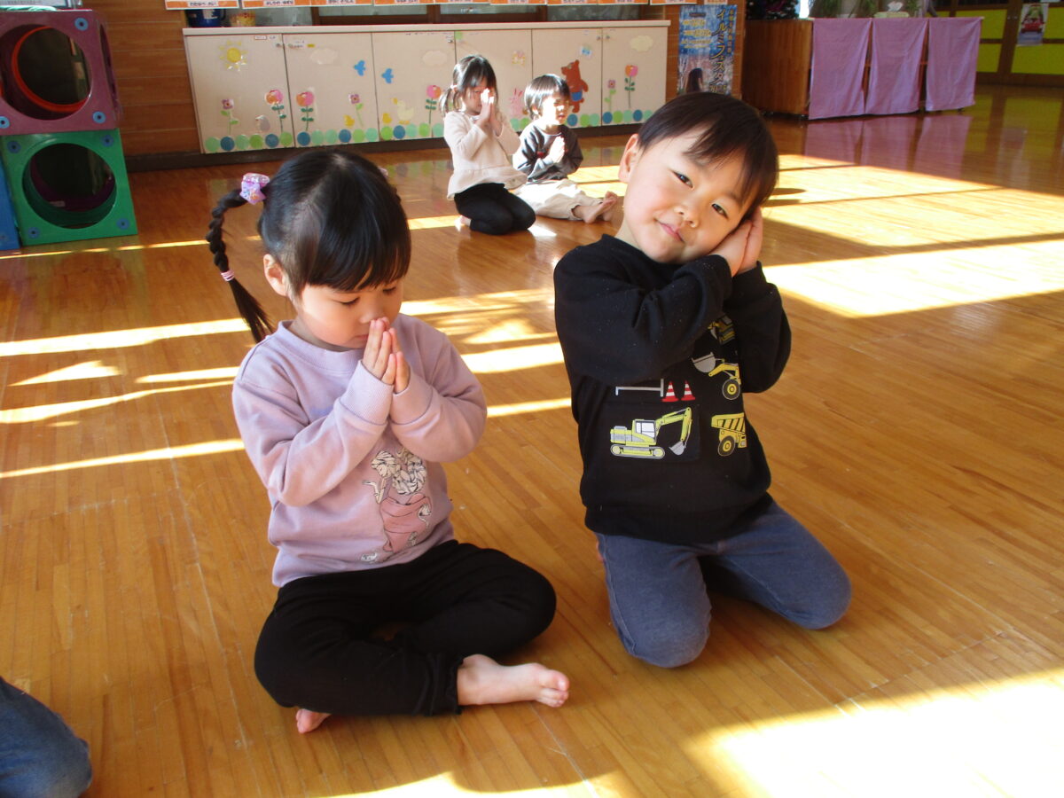 講師の先生の言う言葉に合わせたポーズをとって遊びました。みんなよく聞いて瞬時に動いていました。