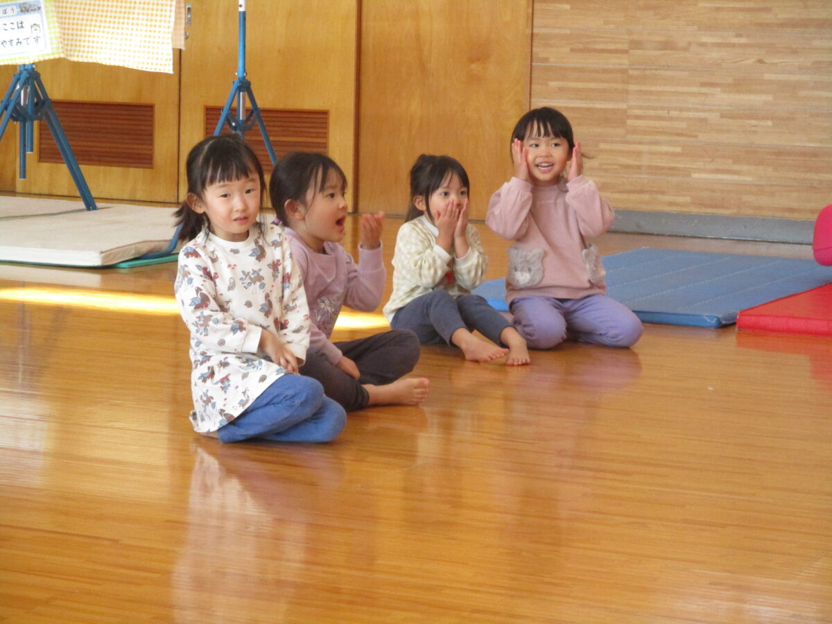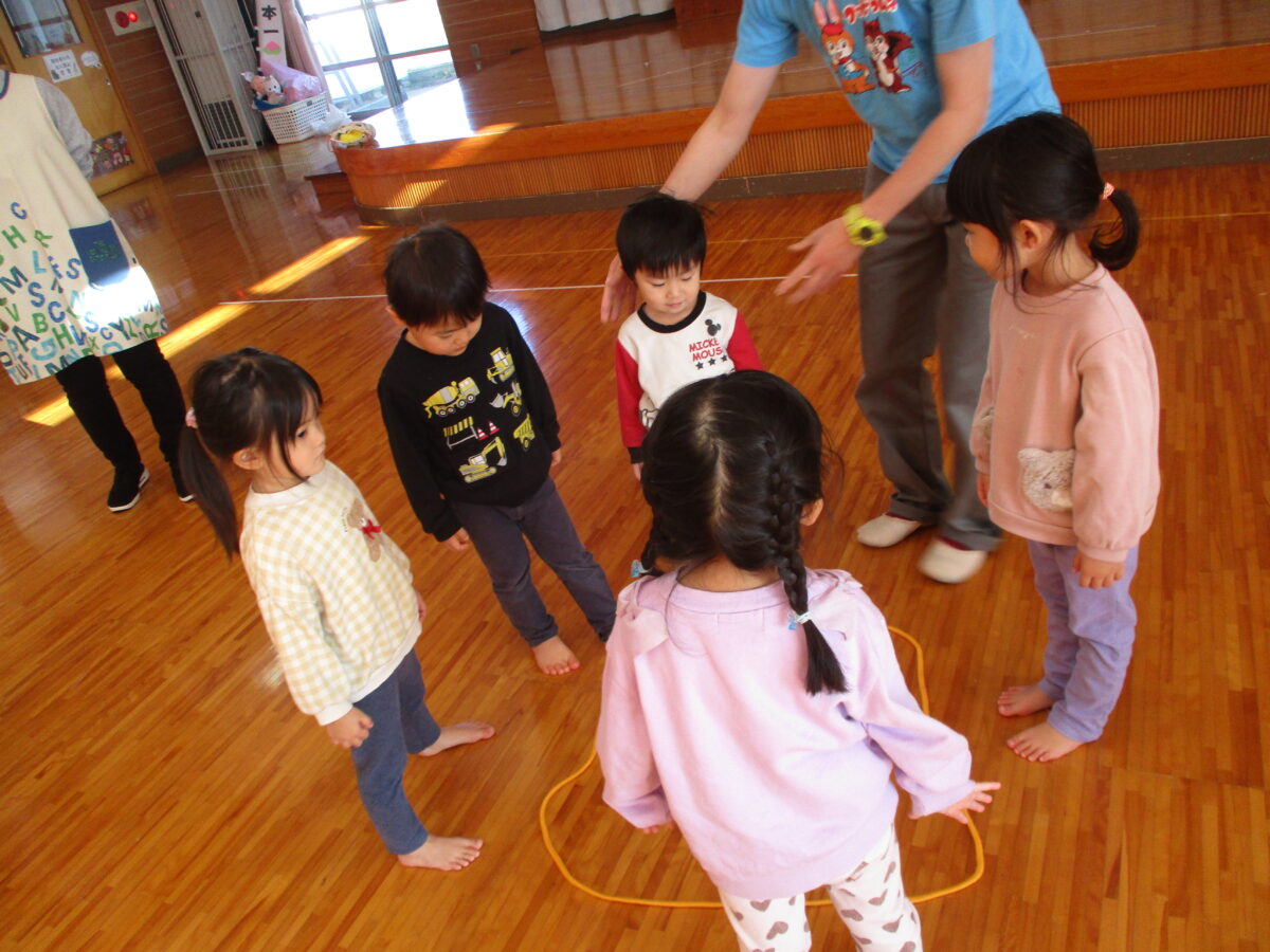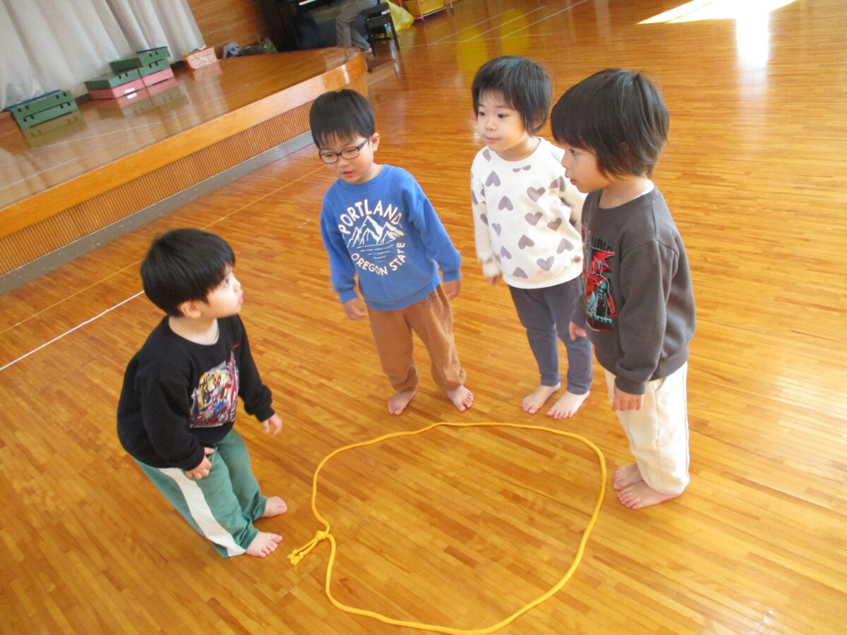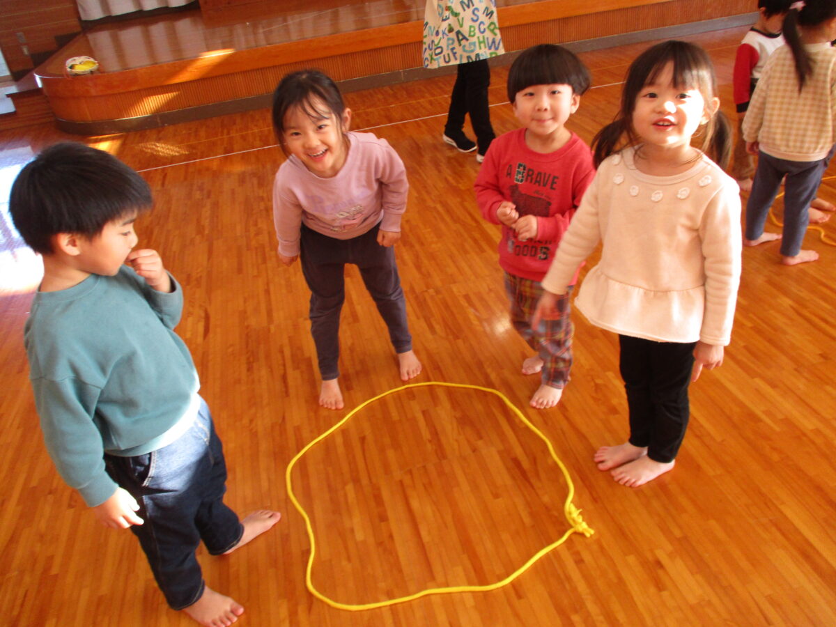 縄跳びで丸を作り、クリスマスの音楽に合わせて丸の中に入ったり出たりしました。リズムに合わせてぴょんっと中に入り、みんなで笑い合っていましたよ。