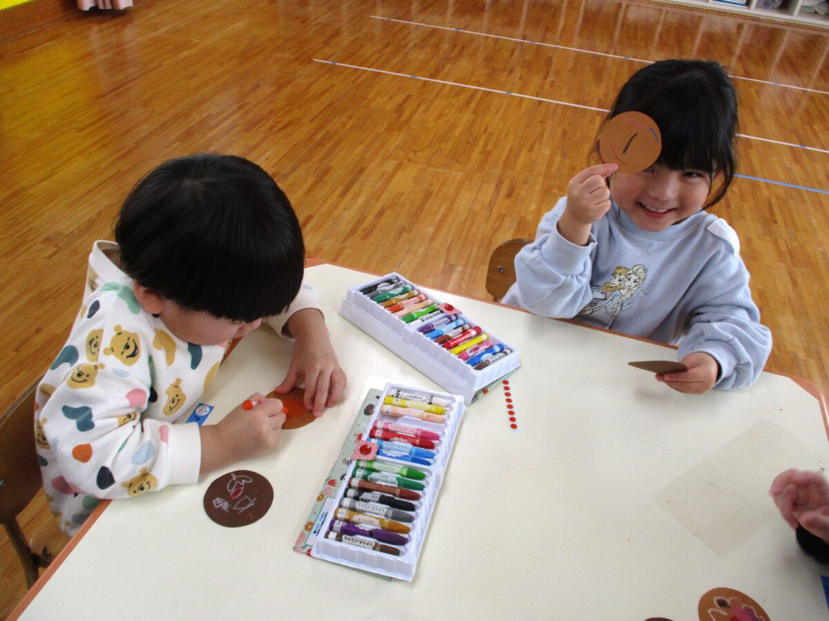 クレヨンで好きな模様を描いたり、シールを貼って可愛く飾りつけをしました。どんなクッキーにしようか悩みながら作っていた子ども達。完成すると、「みてー!」や「できた!」と嬉しそうに見せてくれました。