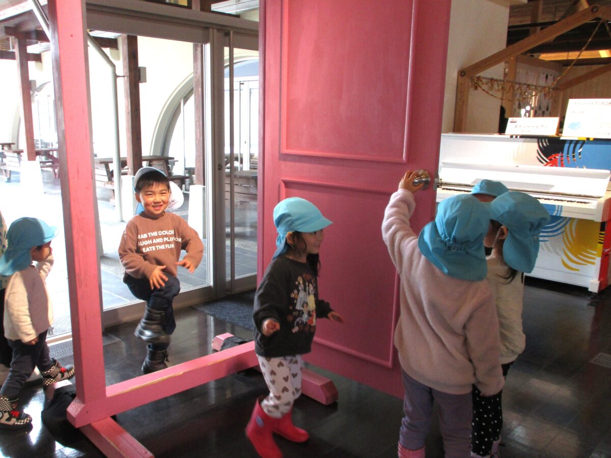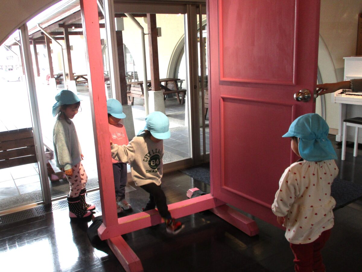 ピンクの扉にも興味津々な子ども達。扉を開けたり、通る時の表情がとても可愛かったです。行きたいところを声に出して通る子もいましたよ。