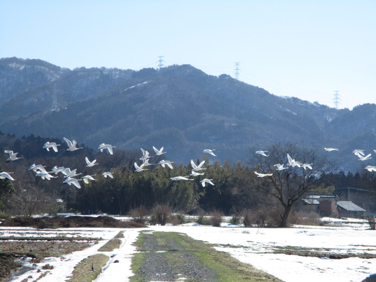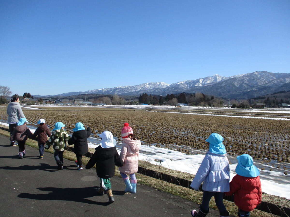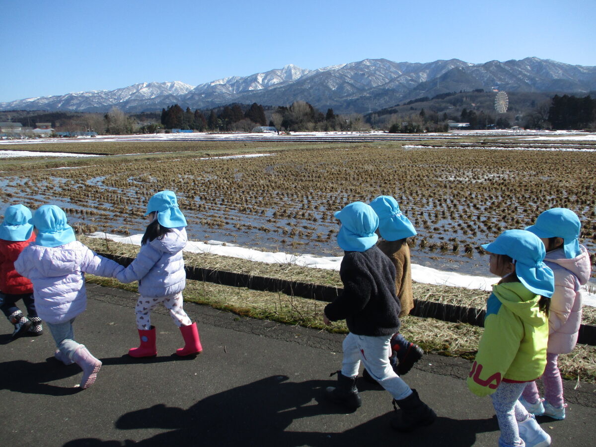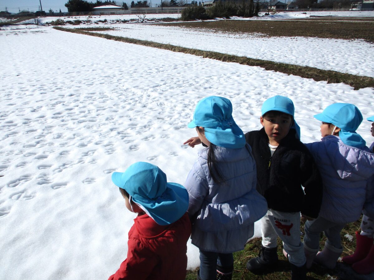 田んぼに沢山の白鳥がいたので、白鳥が逃げないようにそーっと歩いて近づいてみました。こちらの気配を感じて一斉に飛んで行ってしまい子ども達は残念そうにしていました。