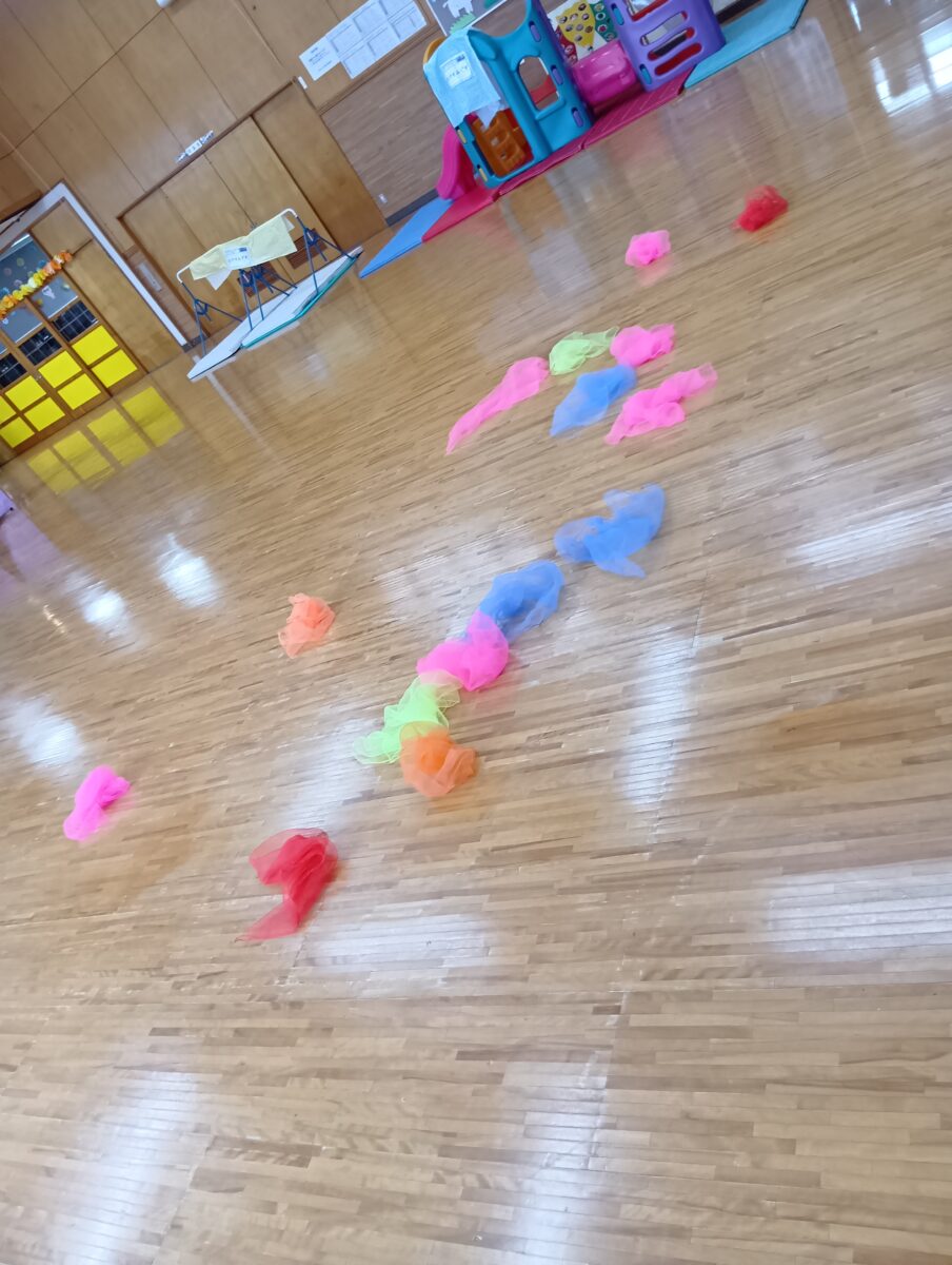 オーガンジー布をクシャクシャに丸めてお花を咲かせてみると、皆とても上手に出来ていました。