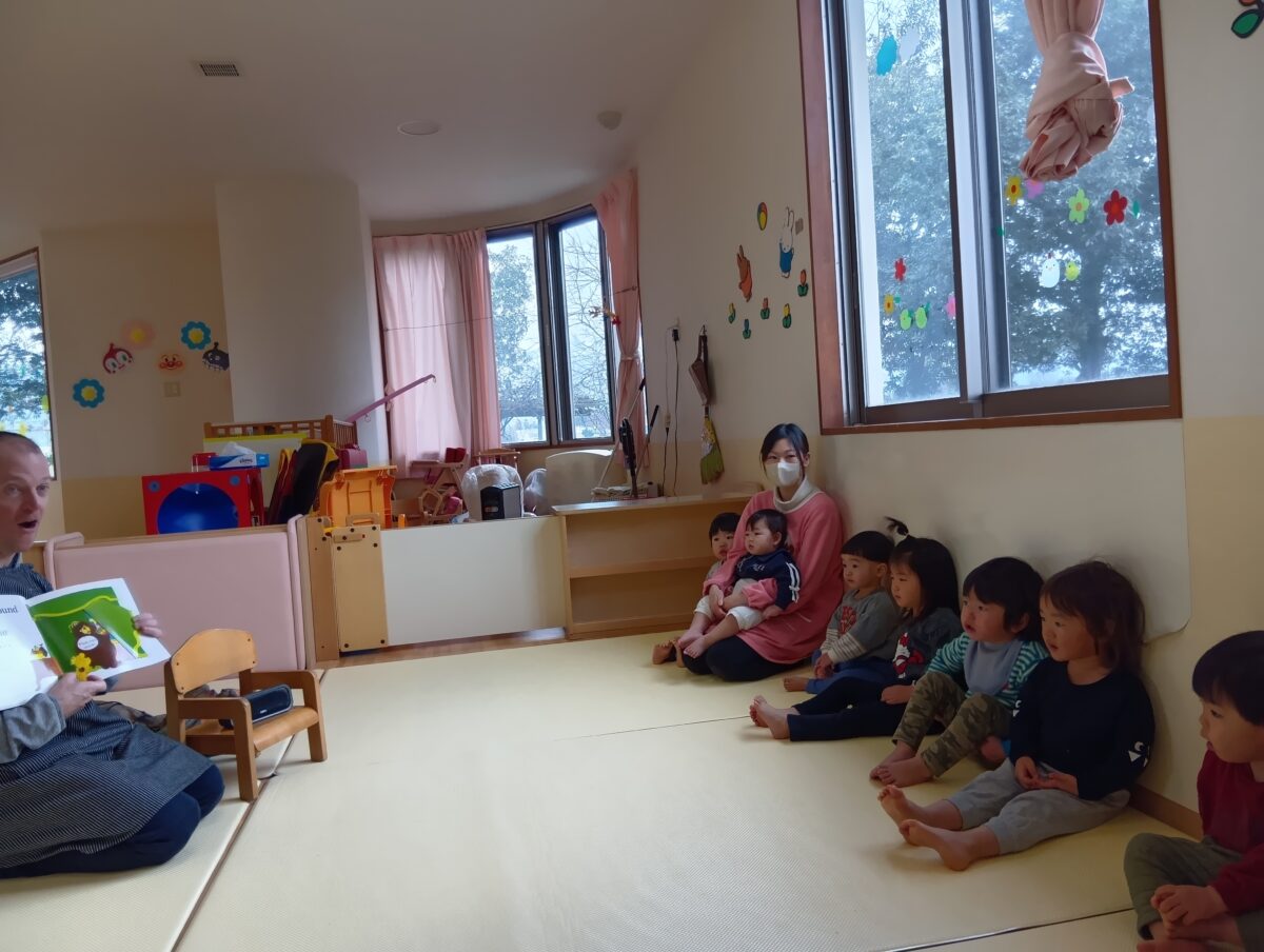 今日はイングリッシュがありました。ベビン先生と一緒に手遊びや絵本を楽しんでいた子どもたちです。絵本はベビン先生が「どっちがいい?」と見せてくれると「「こっちー!」」と指を指して選んでいました。