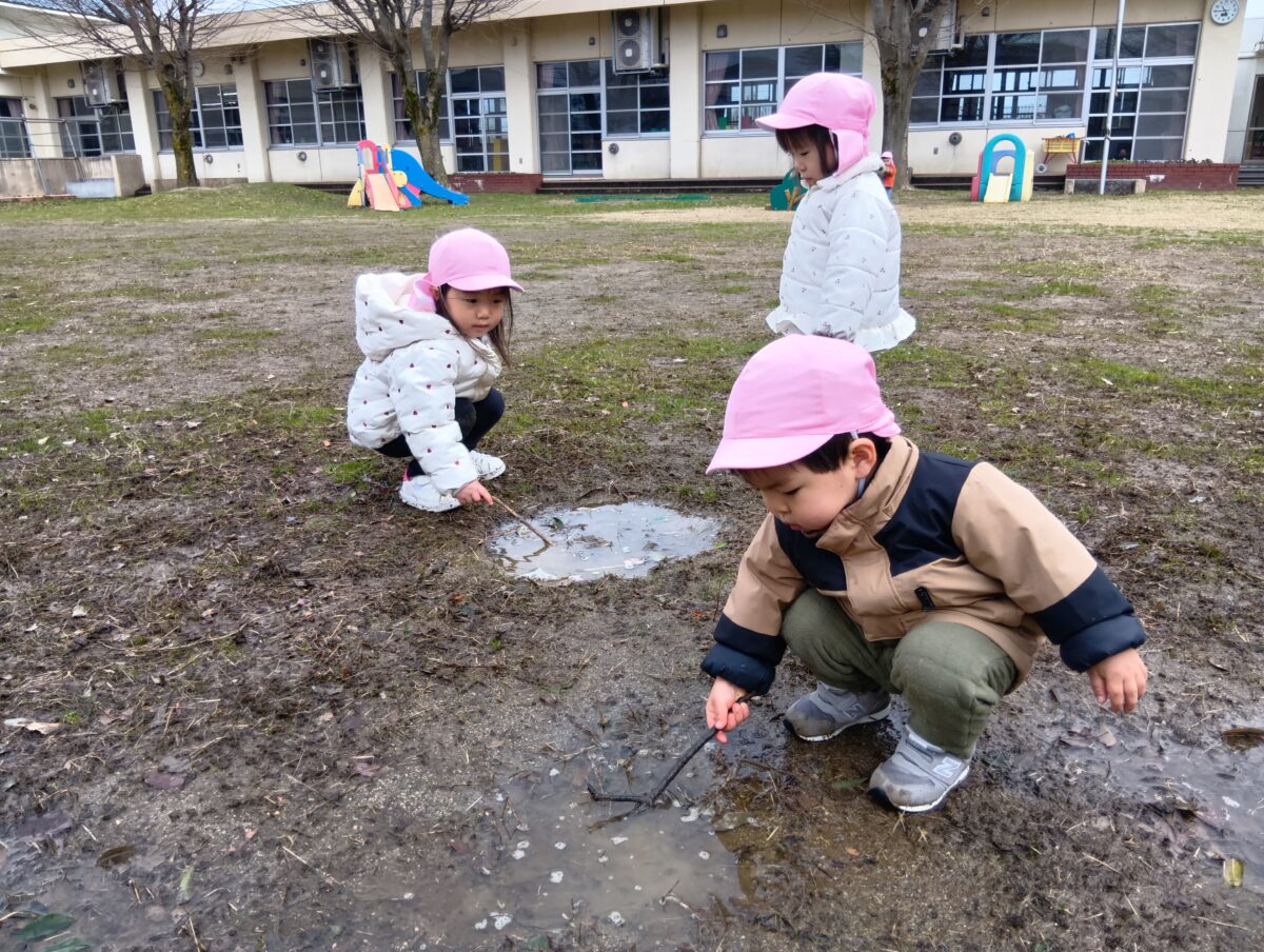 水溜りにも興味深々!自然って面白いね。