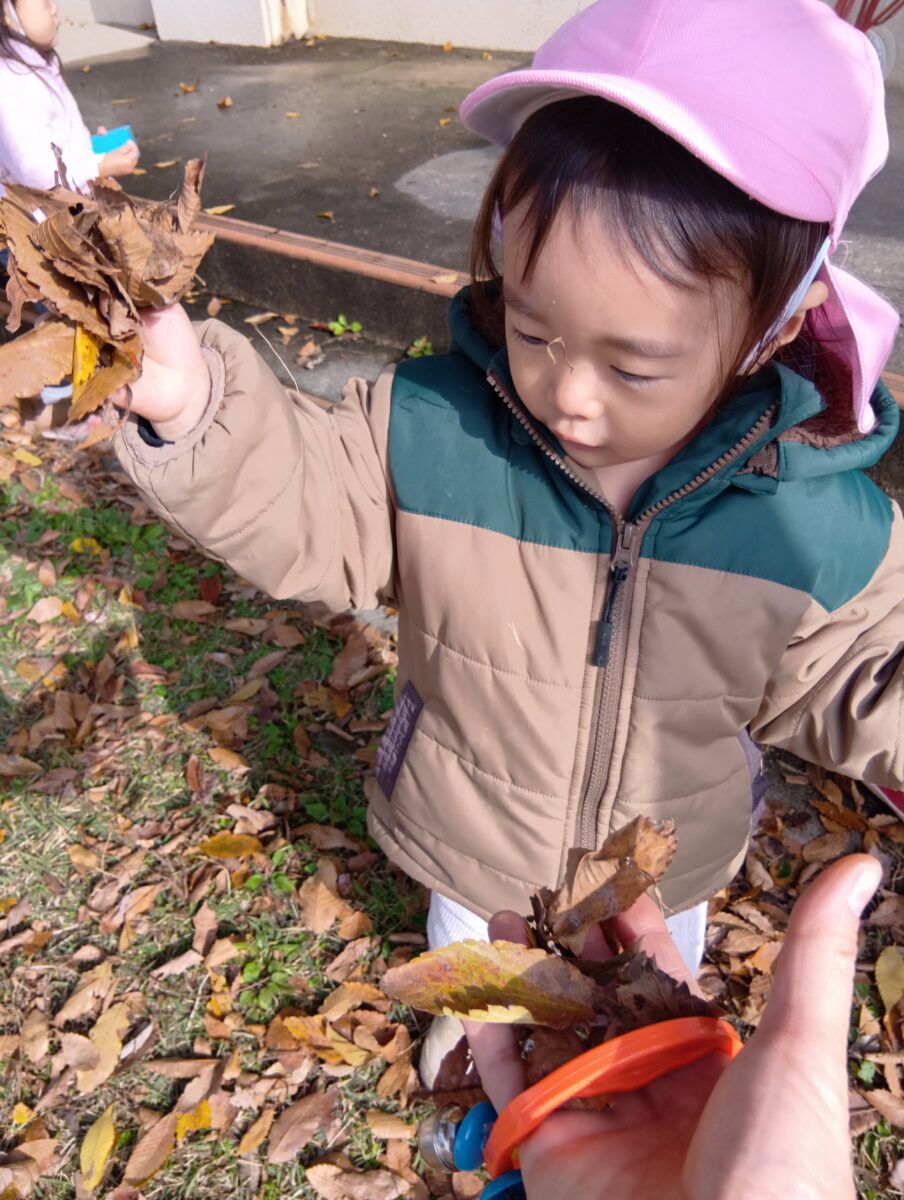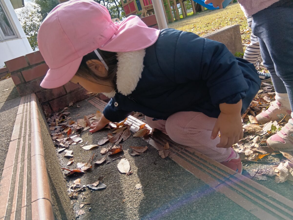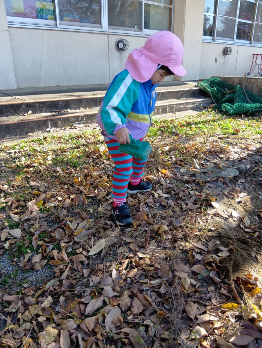 全国的に熊の出没情報が聞かれます。園でも事前の情報収集と園舎周りの安全確認を実施しながら、職員配置や鈴を鳴らしたりや音楽をかけたりするなどの対策を行っています。使用スペースを工夫して園庭遊びのなかで秋の自然を楽しんでいきます。