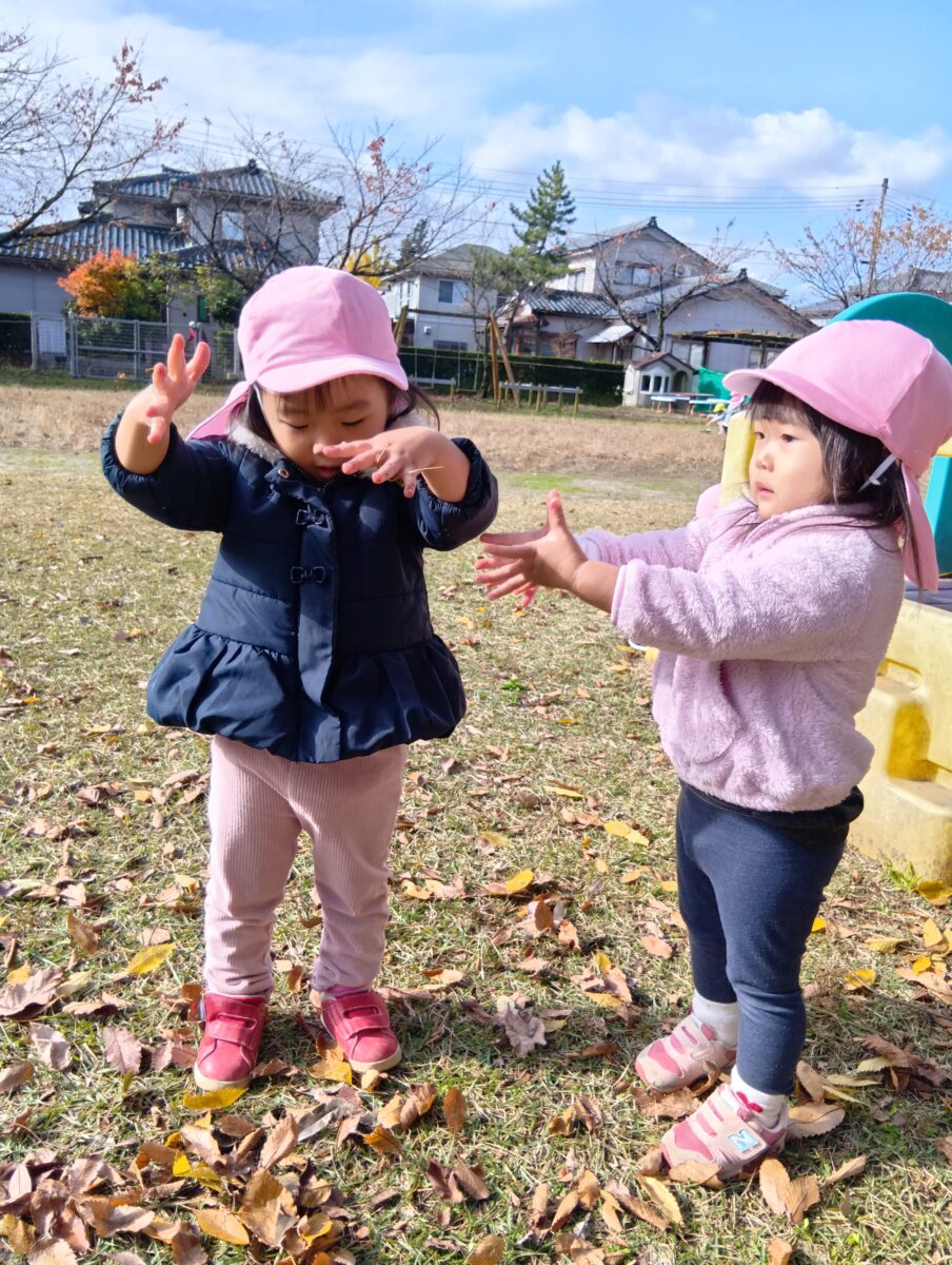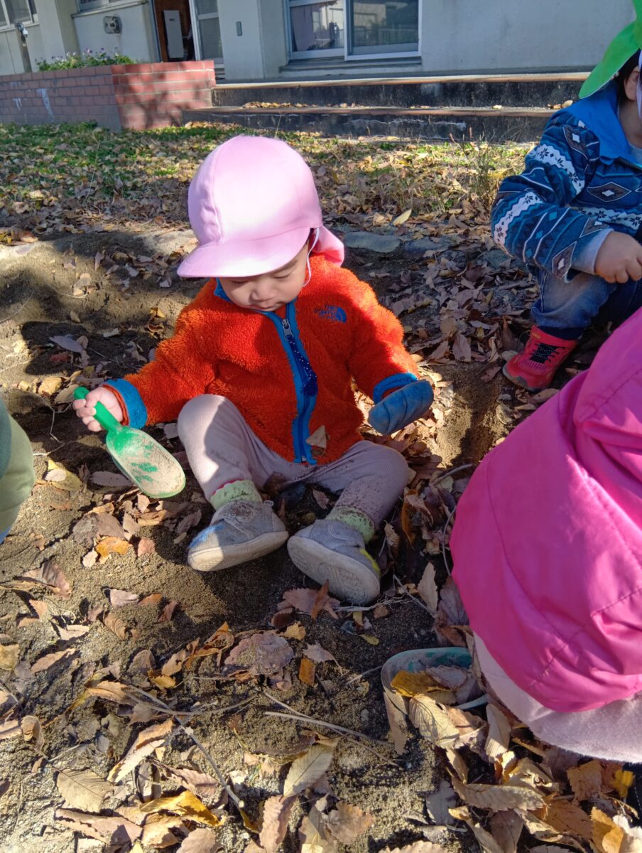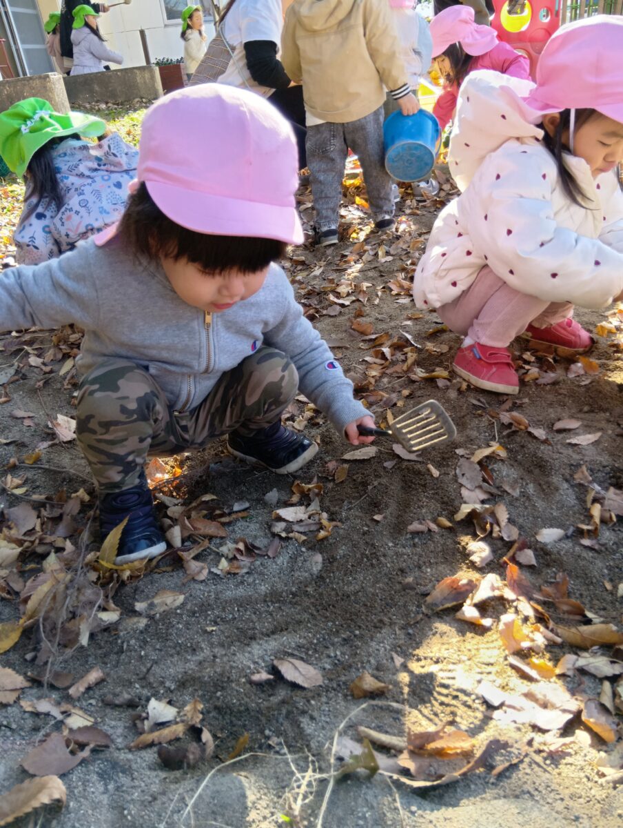 全国的に熊の出没情報が聞かれます。園でも事前の情報収集と園舎周りの安全確認を実施しながら、職員配置や鈴を鳴らしたりや音楽をかけたりするなどの対策を行っています。使用スペースを工夫して園庭遊びのなかで秋の自然を楽しんでいきます。