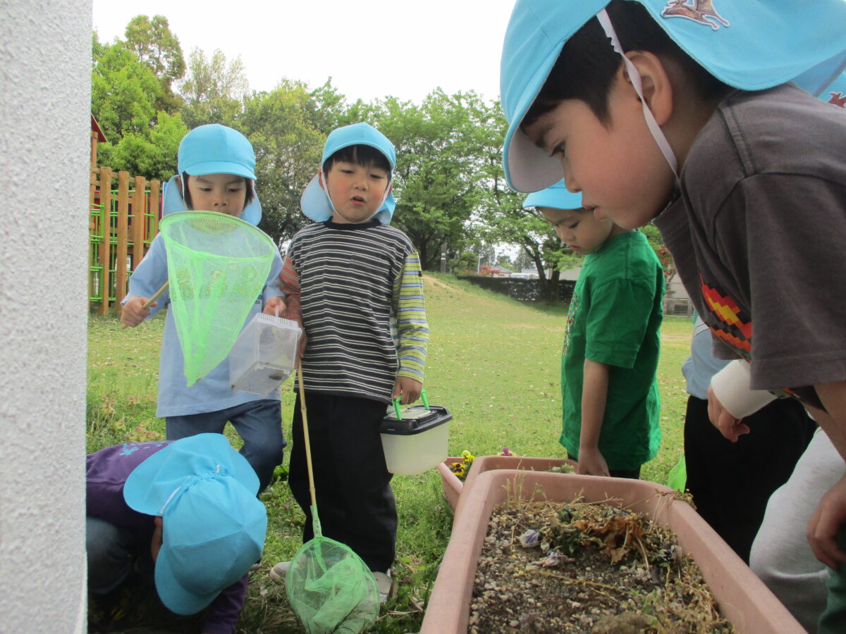虫がいそうな場所をよく知っている子ども達。「虫いたー!」と誰かが言うと次々と子ども達が集まってきて「どこどこ?」と探します。虫を捕まえると一目見ようと更に子ども達が集まってきます。