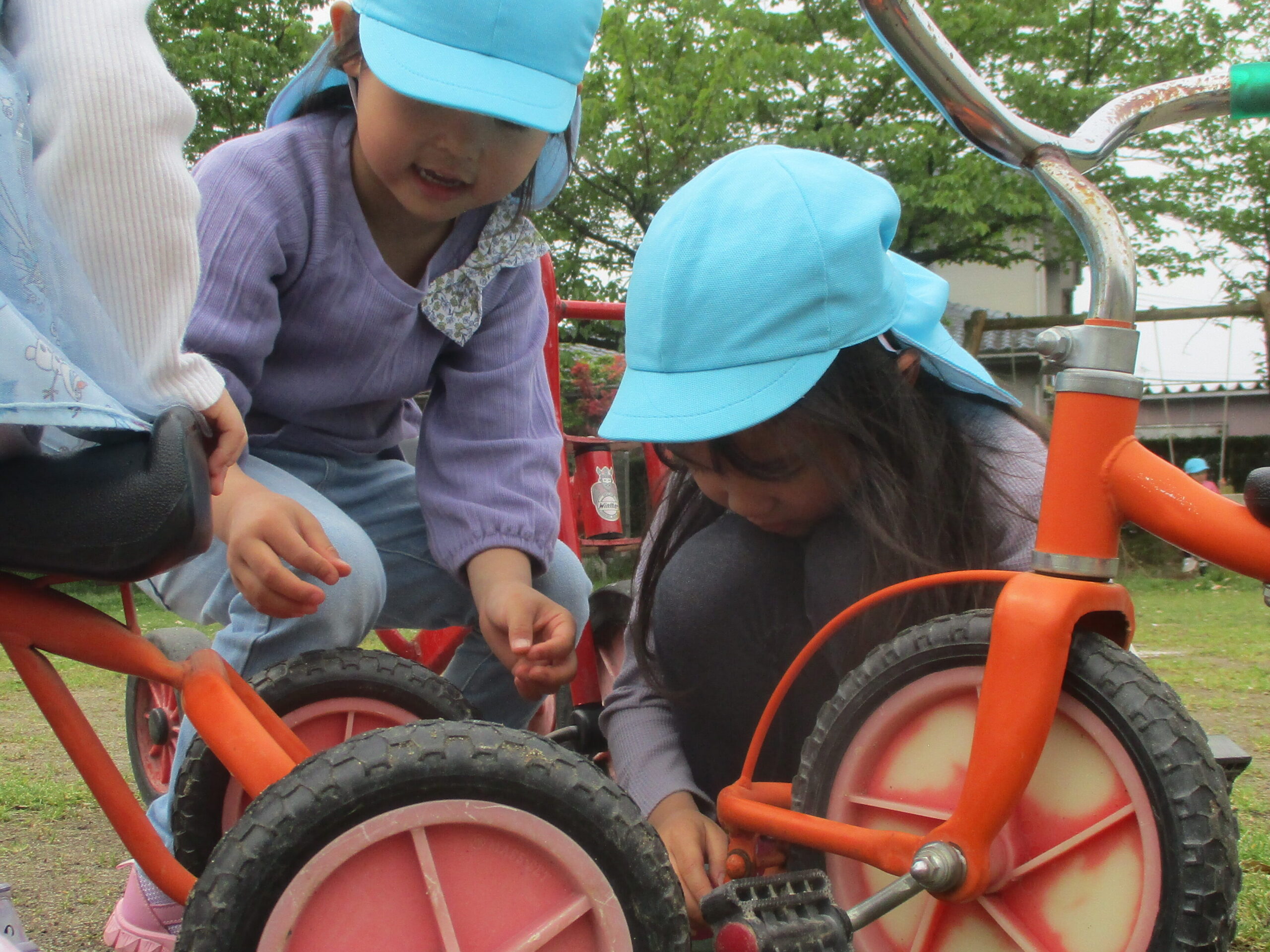 三輪車同士をつなげることができるのですが、「せんせい、つなげて~」と言いながらも自分たちで繋げてみようと挑戦する姿が見られます。