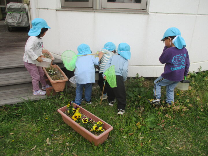 丁度良い風が吹いていたので、たこを持って園庭へ。築山に登ってたこを揚げたり、園庭内を走ってたこを揚げたり、風が吹く中楽しんでいました。