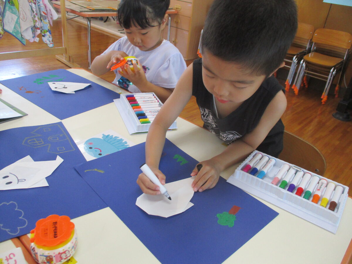 お化けの折り紙も作りました。廊下に飾っていますのでぜひご覧ください。