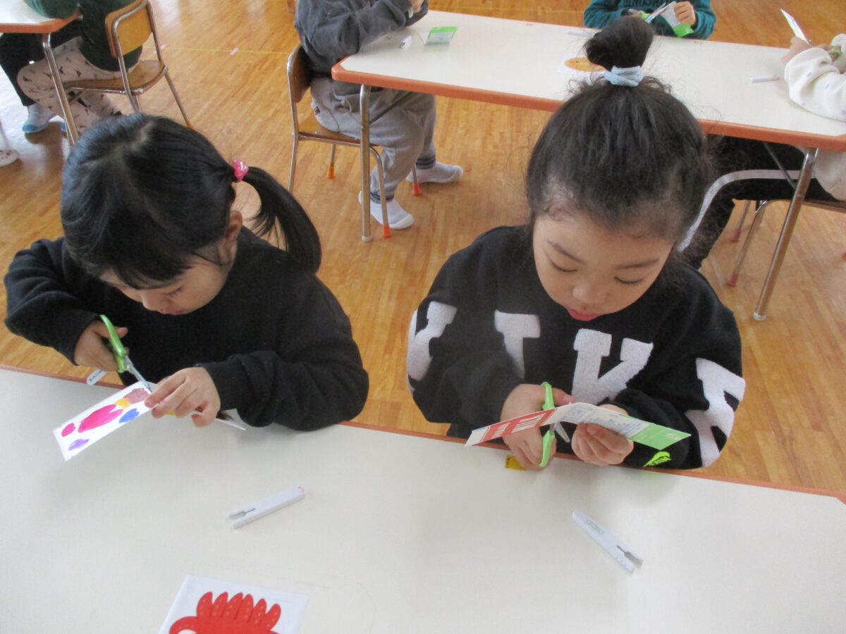 ぴょんぴょんガエルも作りました。なかなかうまく飛ばなかったので、改良を重ねてリベンジすると跳ぶようになり事務室の先生方にも披露しに行きました。