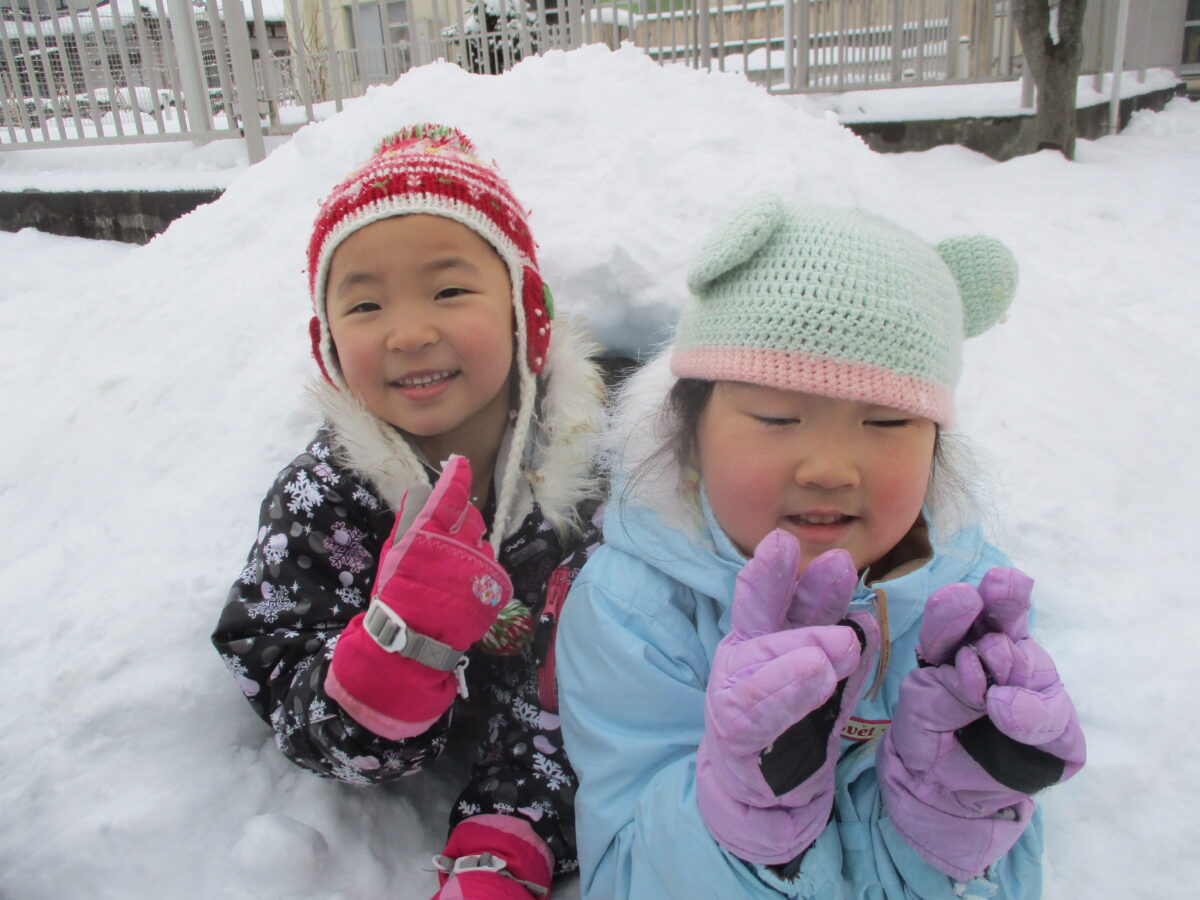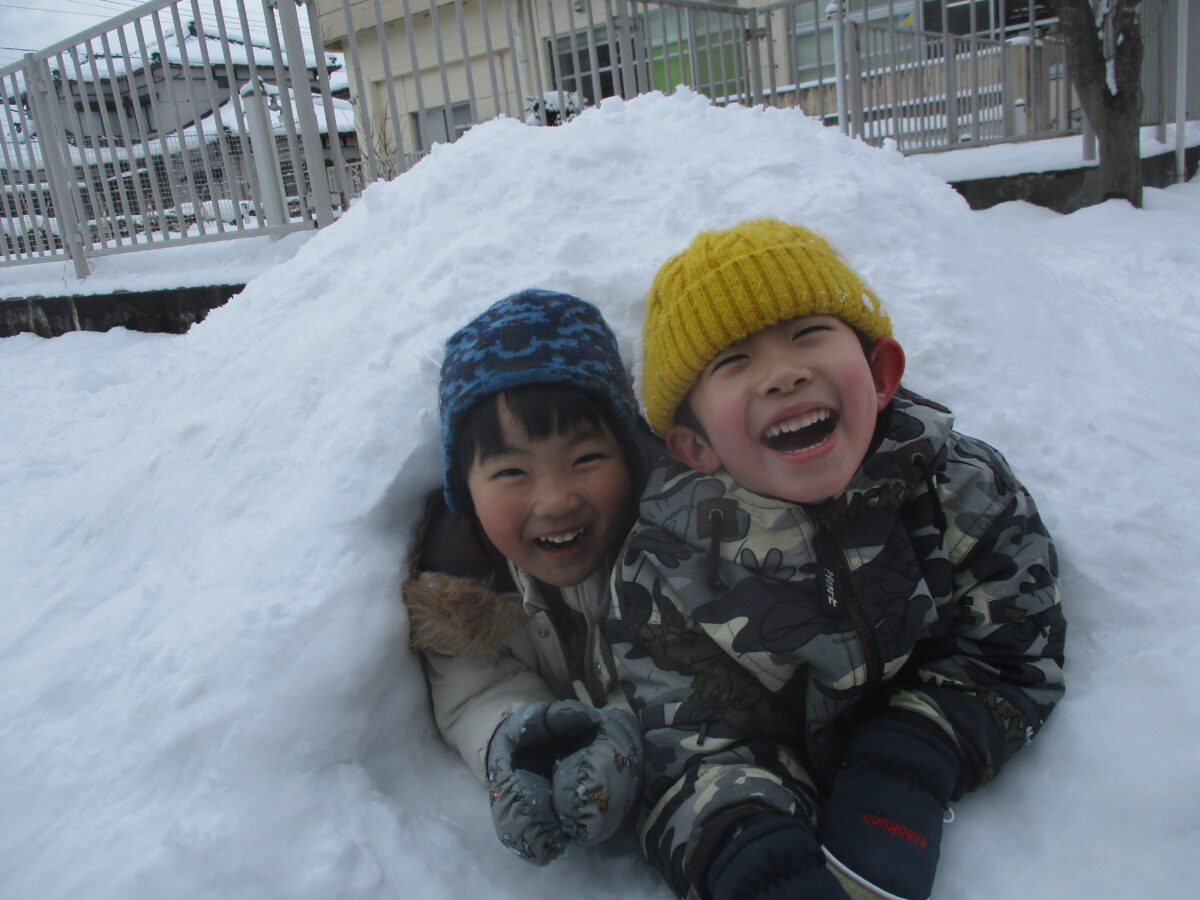 雪が降り積もり雪遊びを満喫しています。子どもたちと数日かけて雪山を作りかまくらを作りました。少し小さかったですが、かまくらの中に入りたいお友だちが続出で、頑張って作って良かったです。