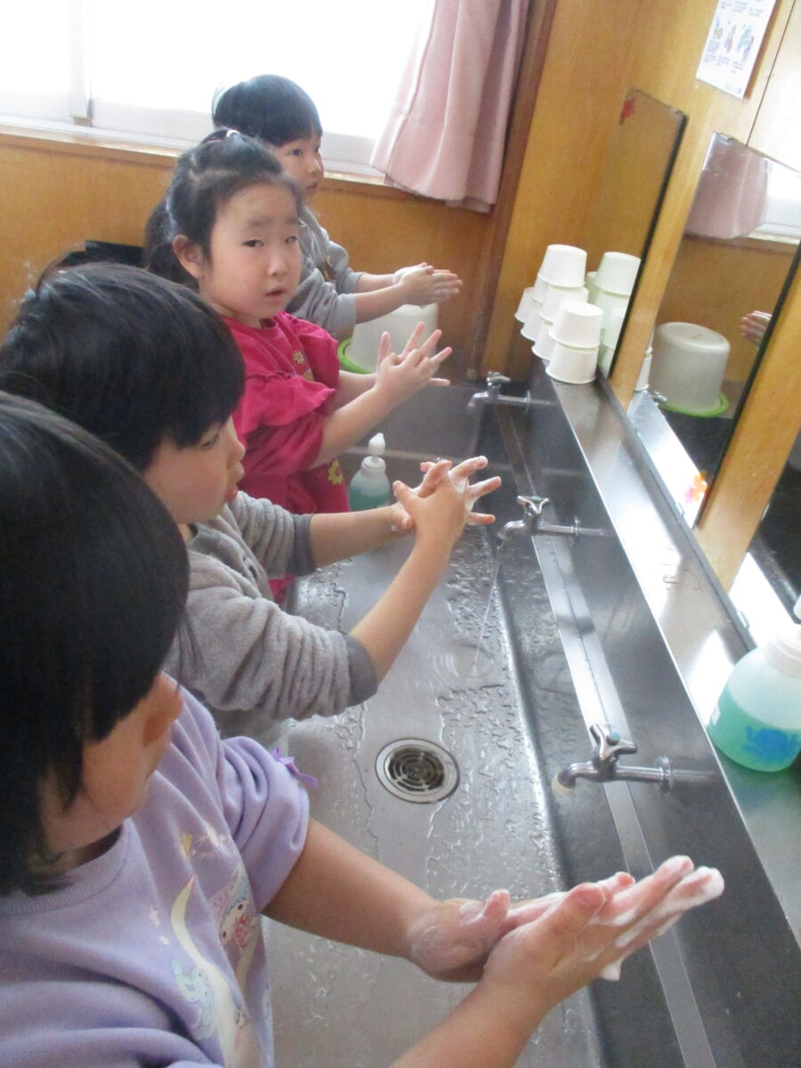 今日は看護師の先生から手洗い教室をしてもらいました。よく話を聞いて上手に手洗いをしていました。