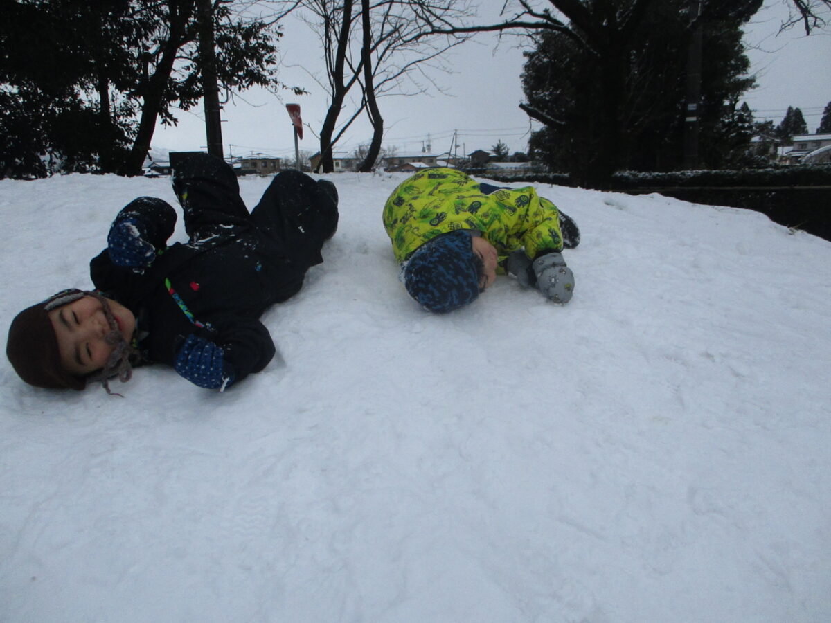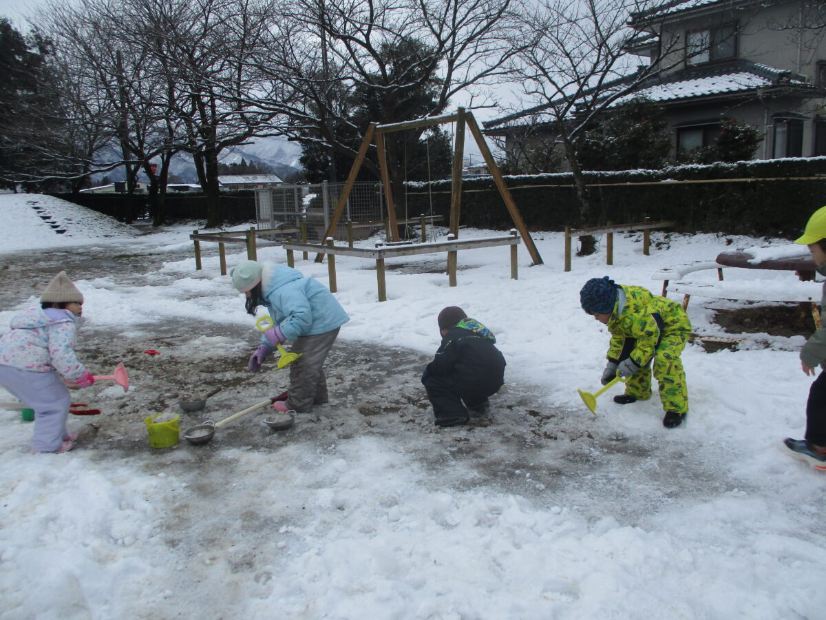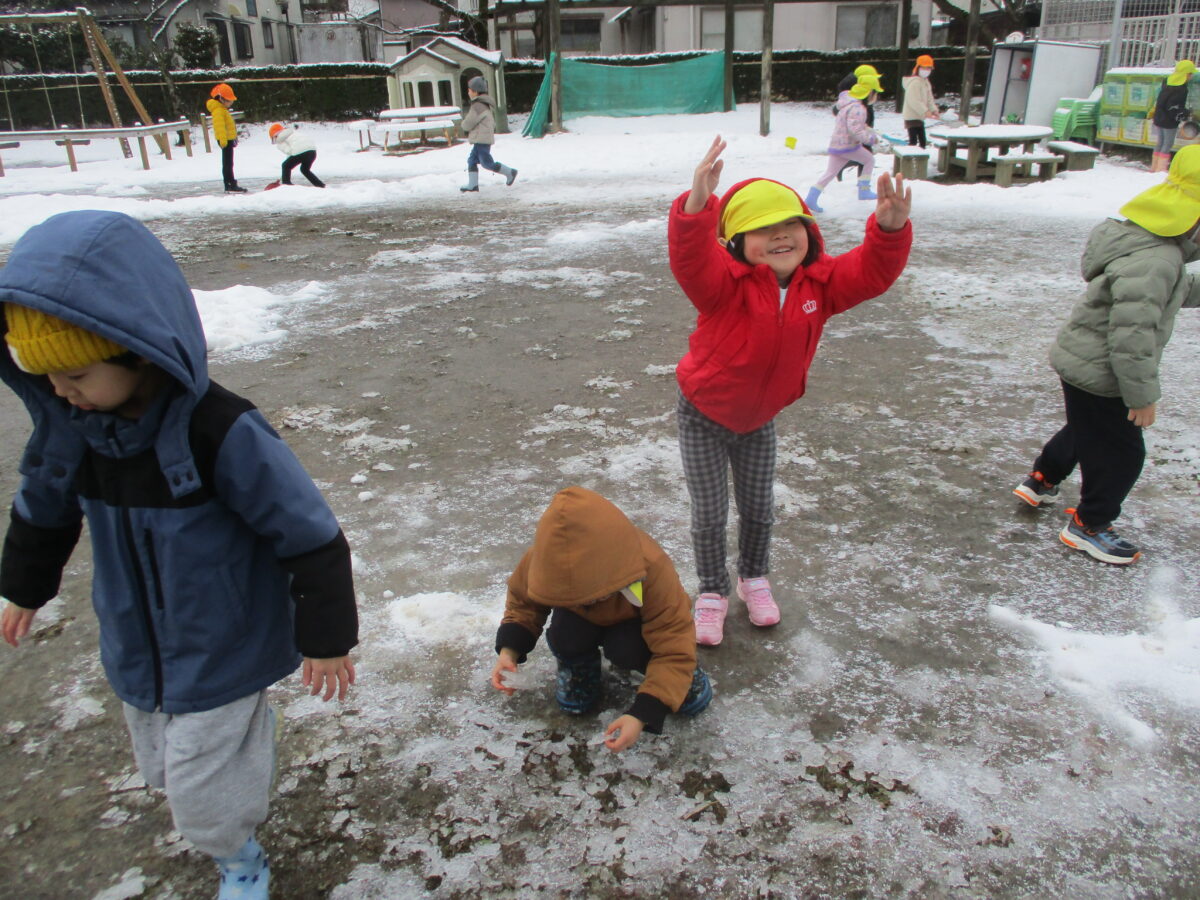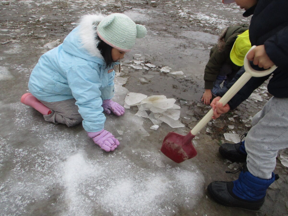 昨日とは打って変わって風が冷たく寒い一日でした。園庭が昨日溶けた水たまりが凍って、スケートリンクのようになっていました。