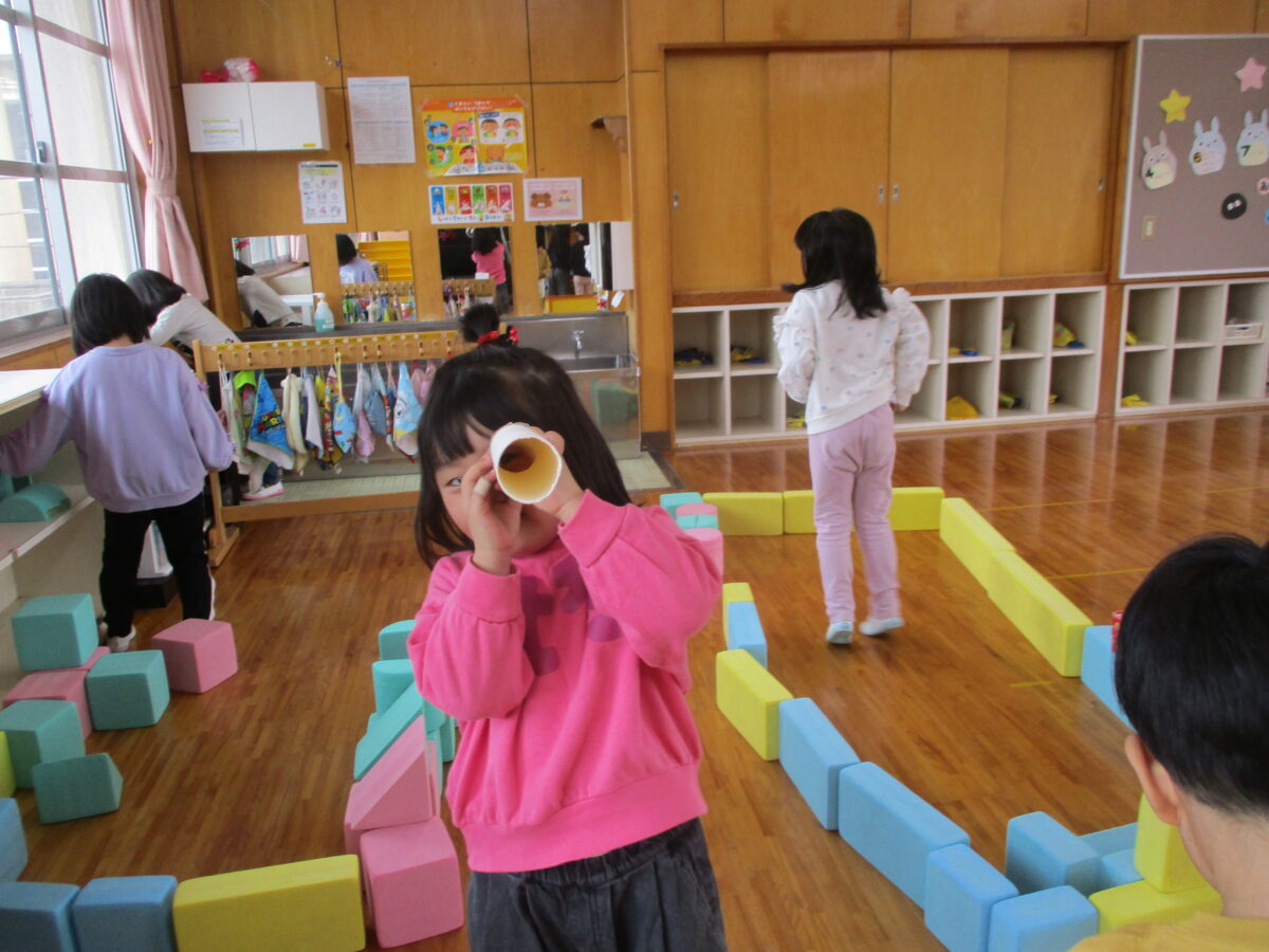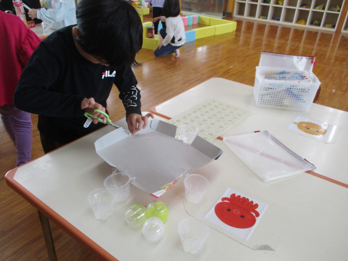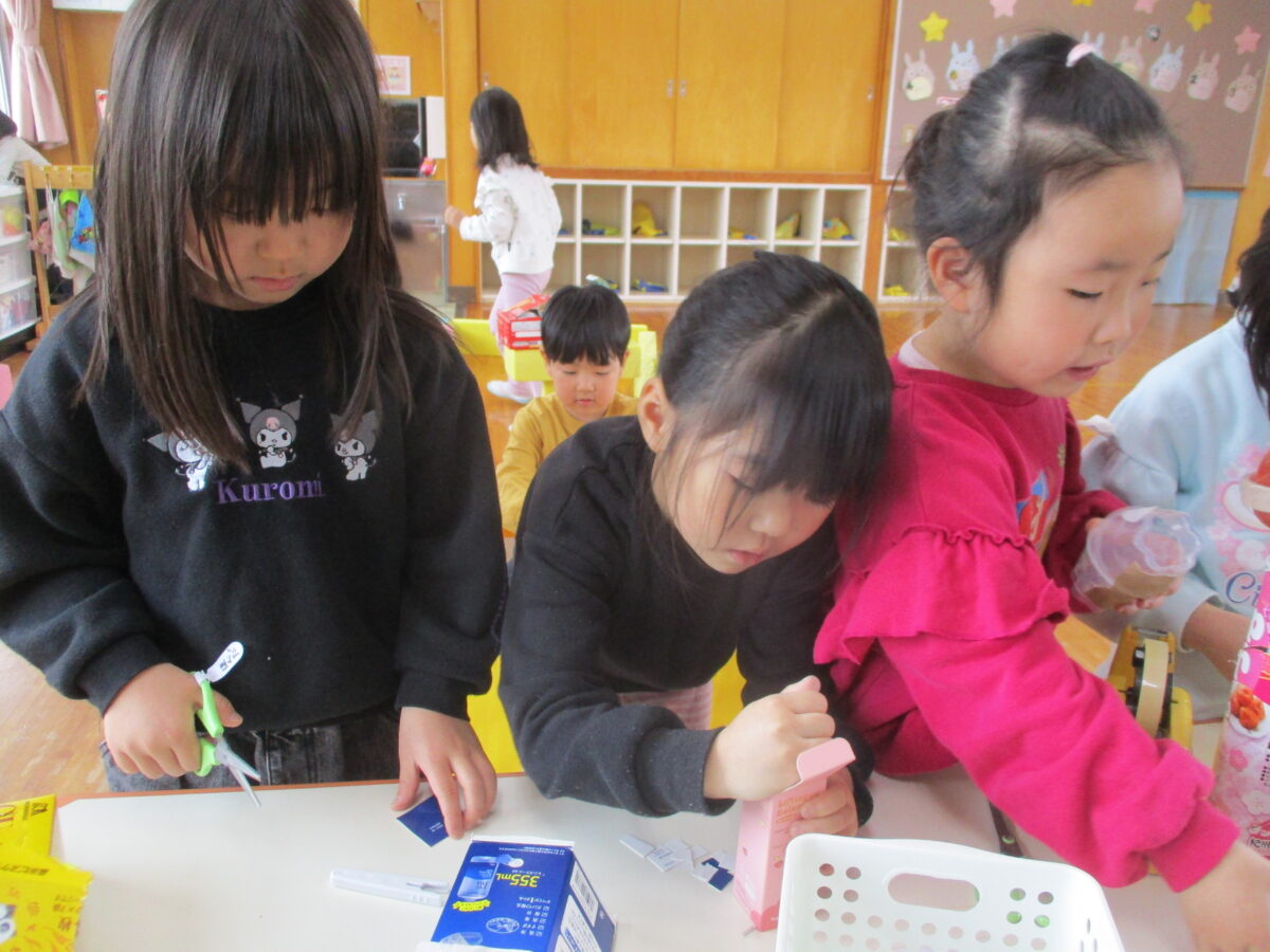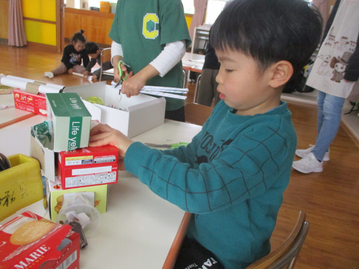 今日はあいにくの雨だったのでお部屋で久しぶりに作り物をしました。色々な発想で面白いものをつくっていました。
