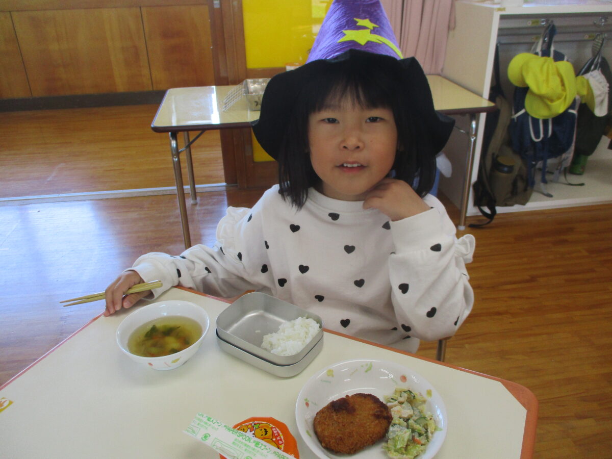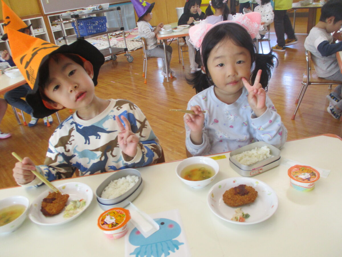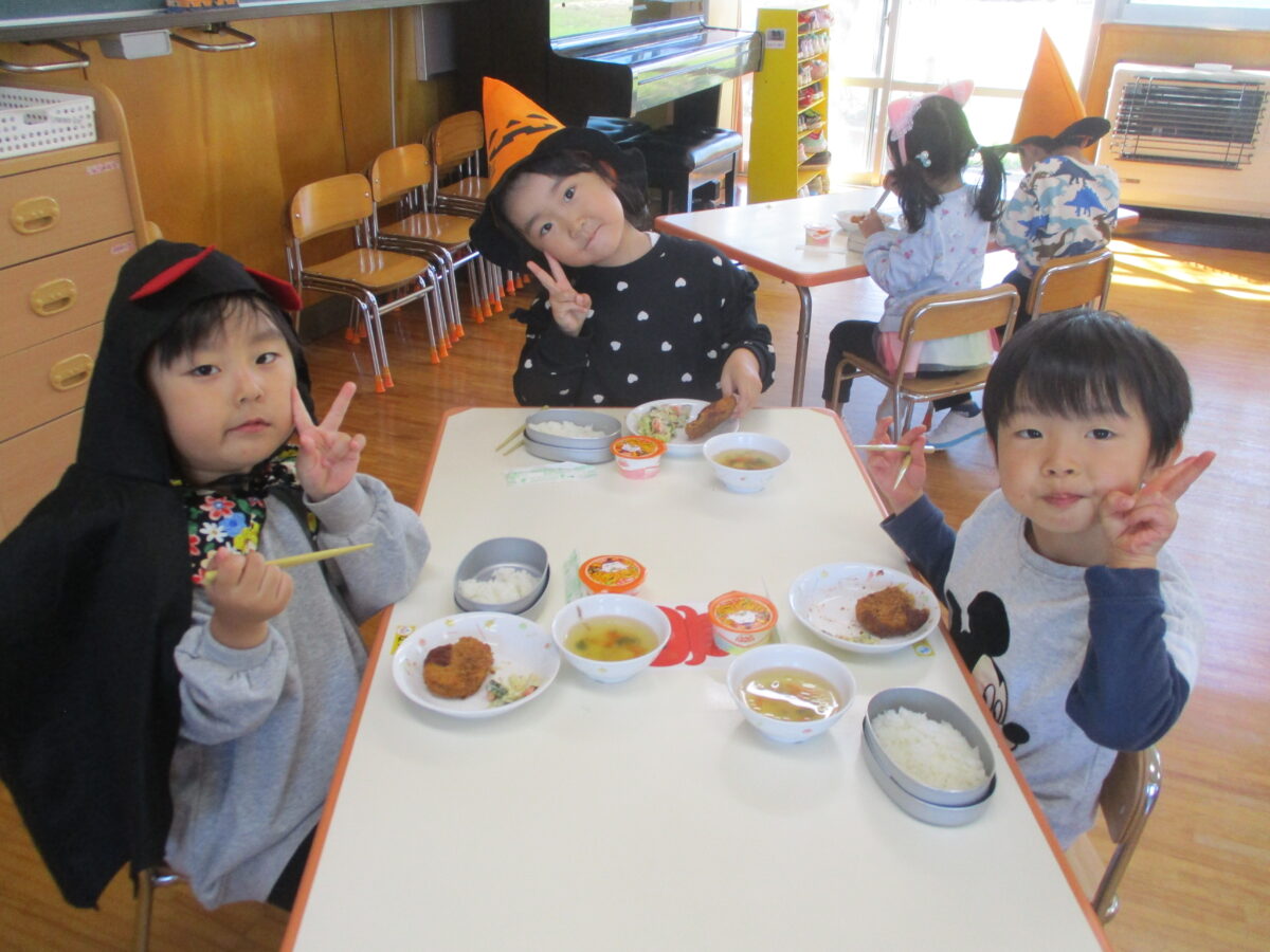 給食も、好きな場所に座りお友だちとハロウィン特別メニューを美味しく食べました。