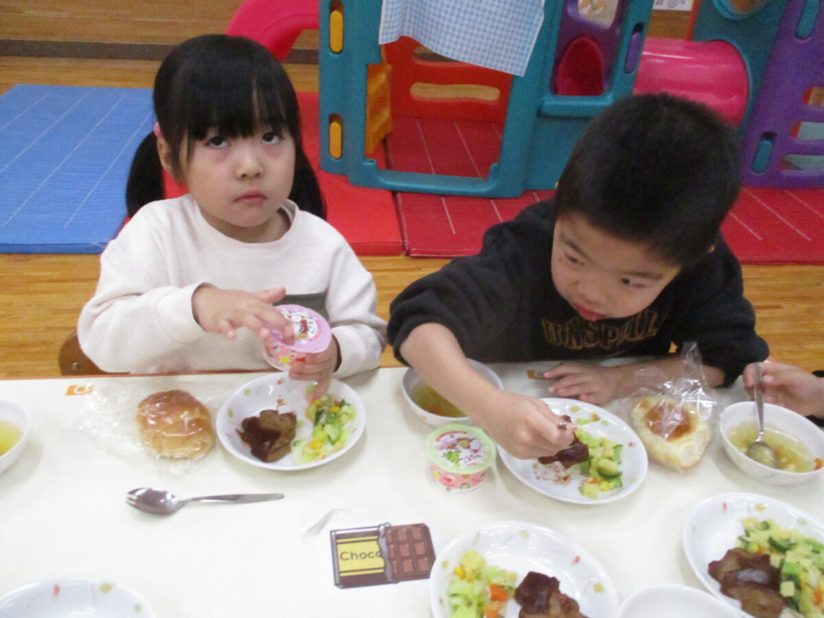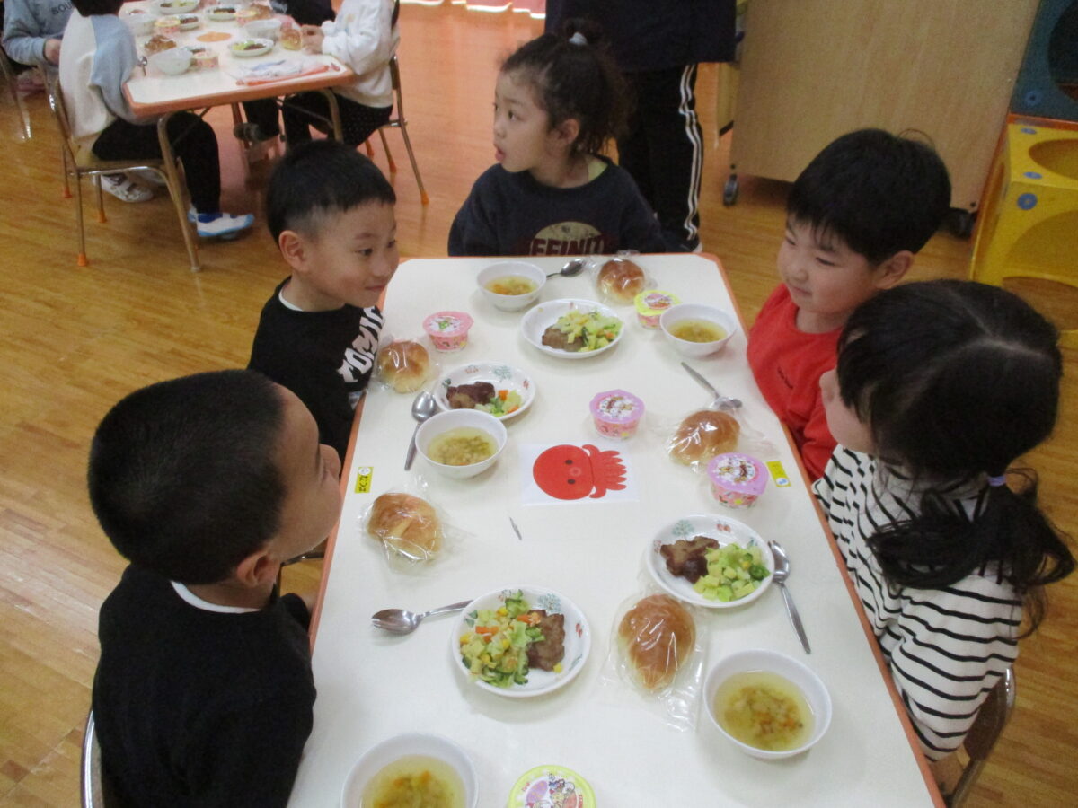 給食は、以上児さんみんなで遊戯室で会食をしました。