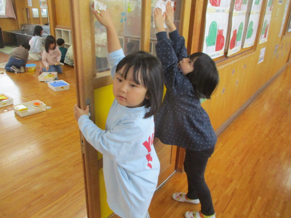 今日は、みんなでお部屋や廊下、玄関等の拭き掃除をしました。