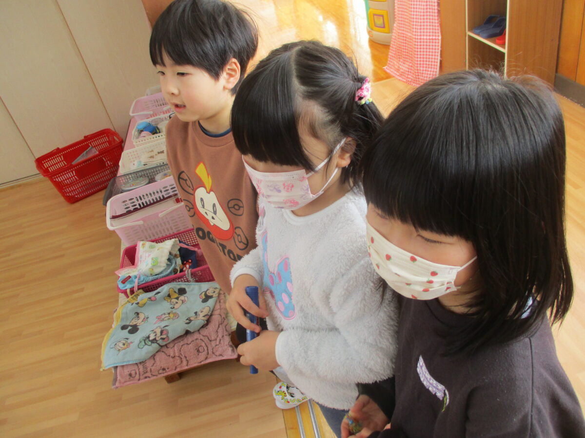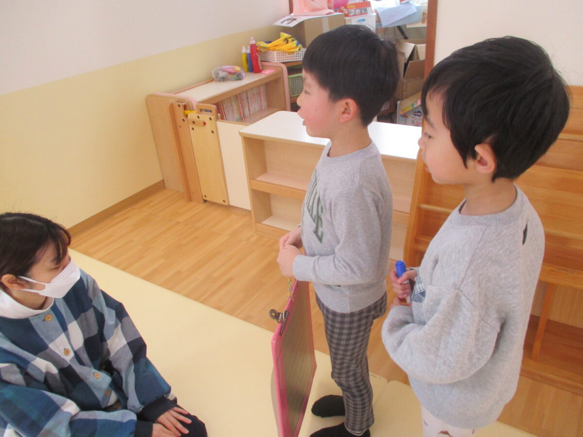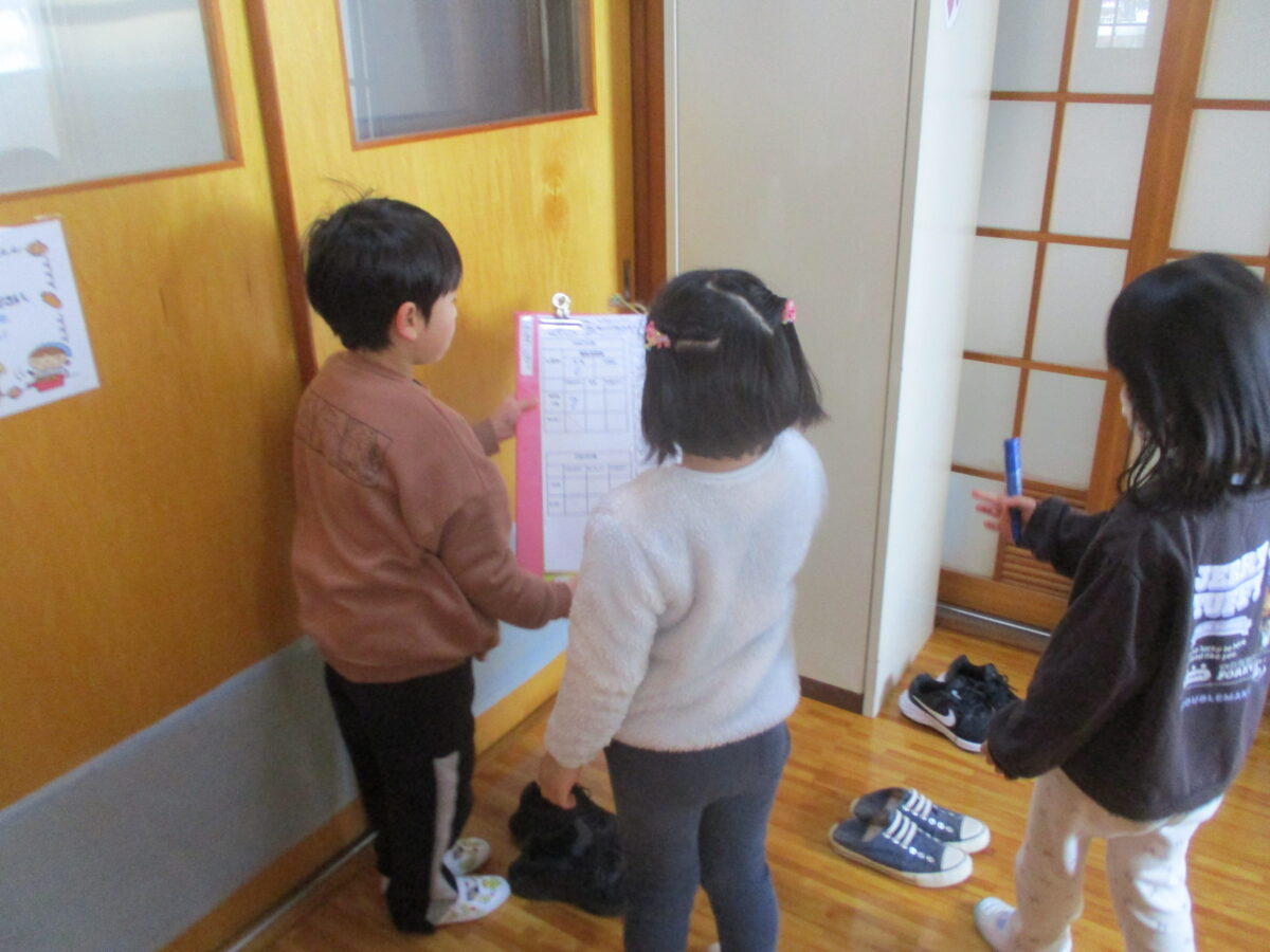 2月に入り、つき組さんに教えて貰いながら、給食の人数を聞くお当番の仕事を頑張っているほし組さんです。