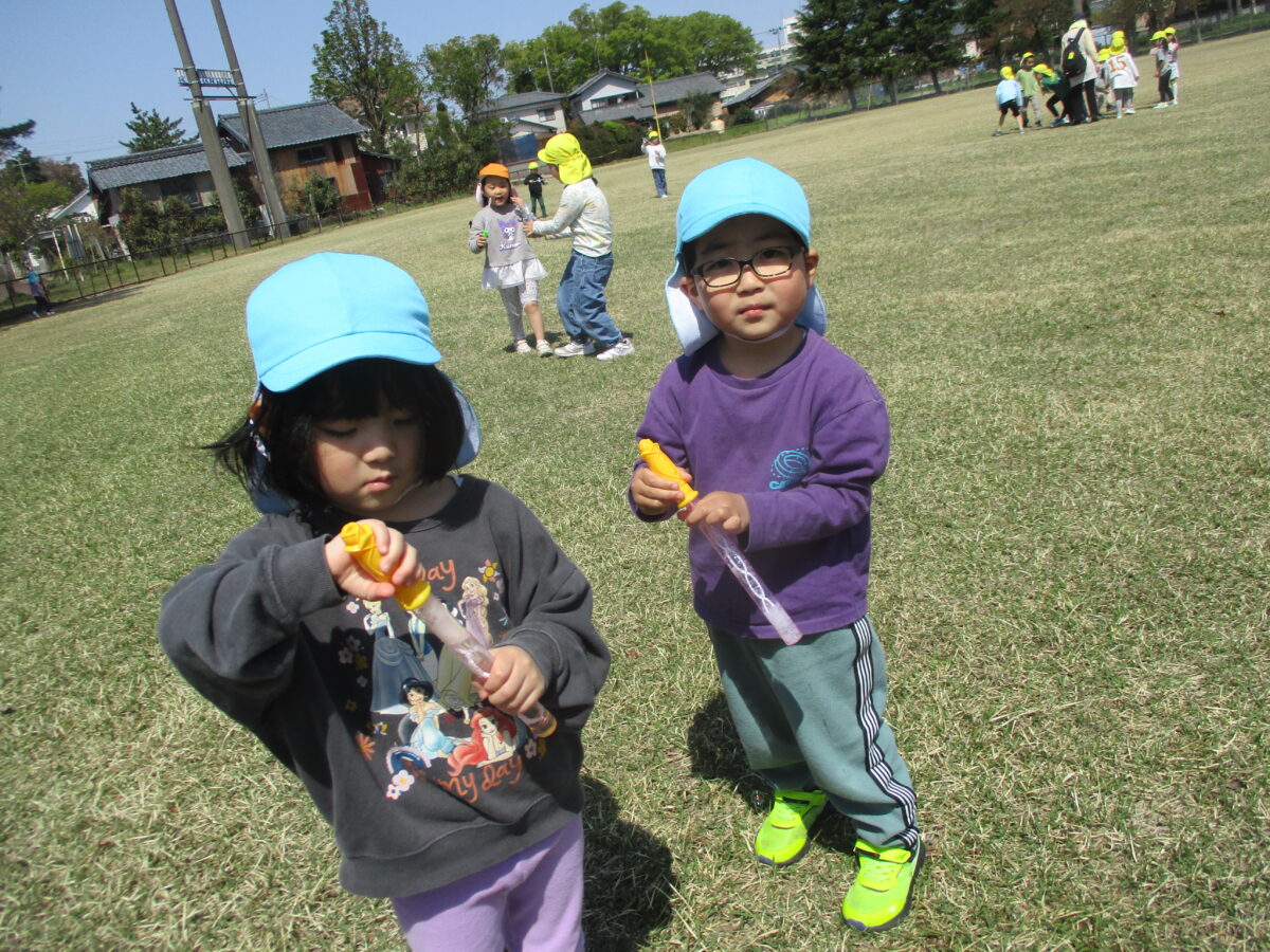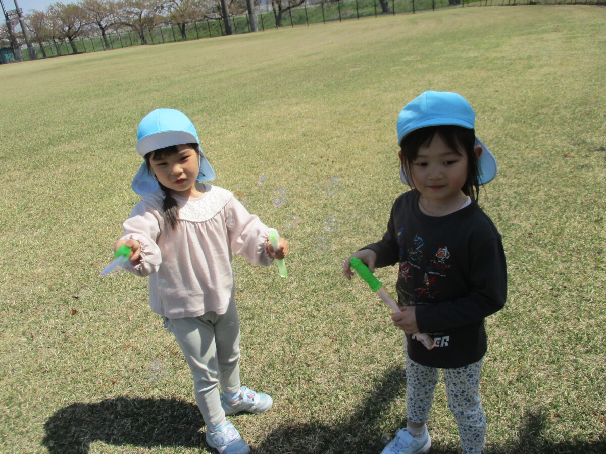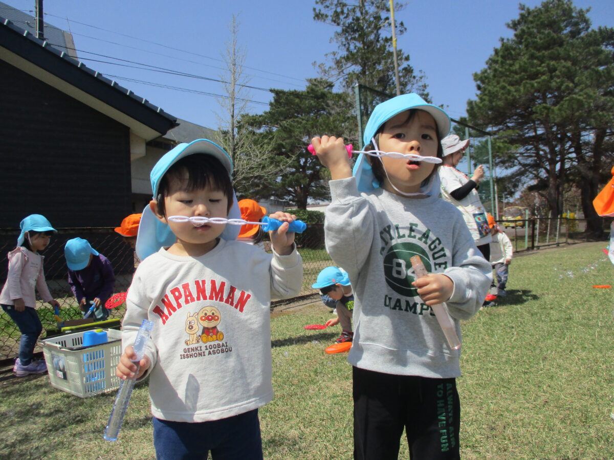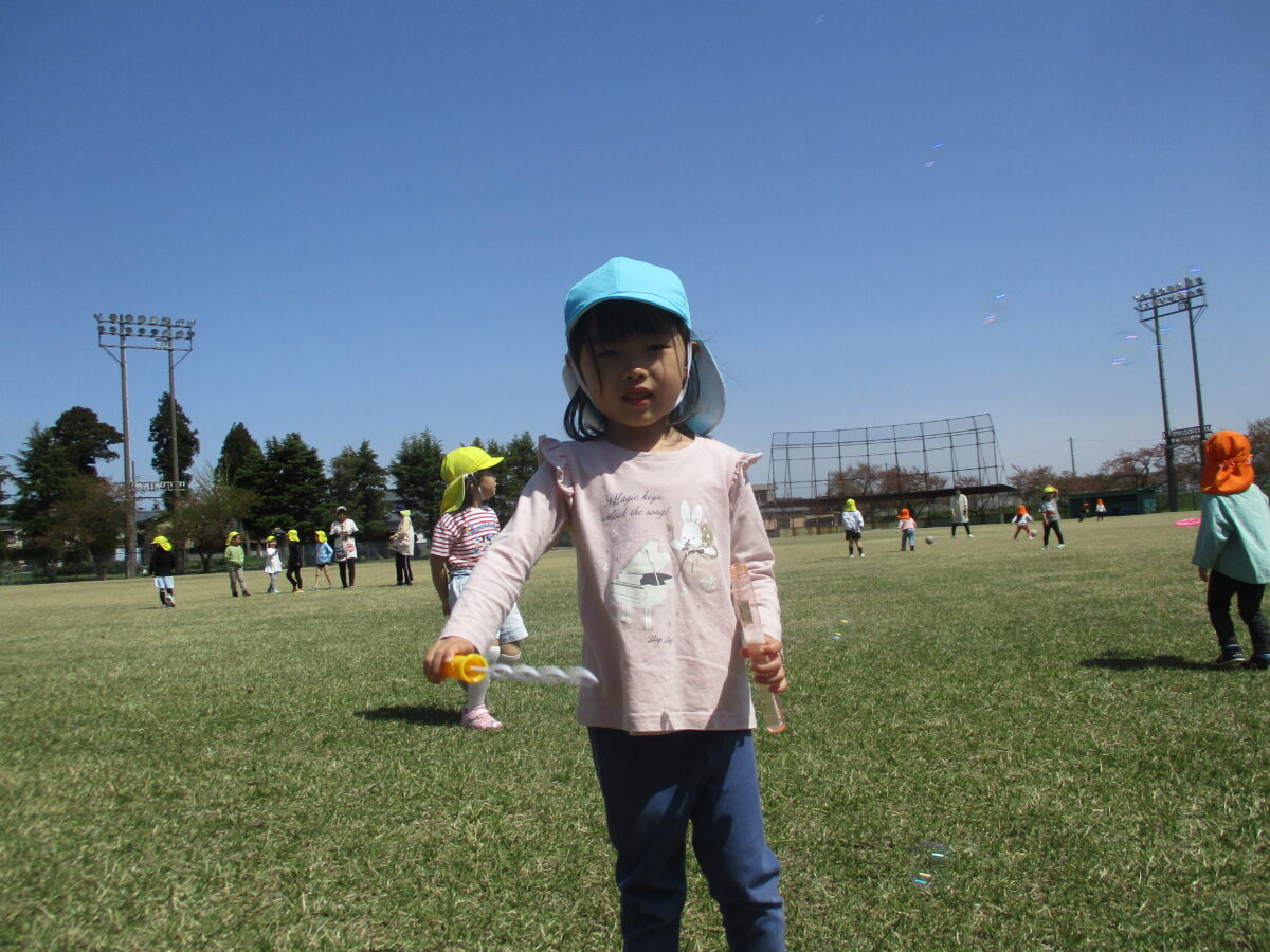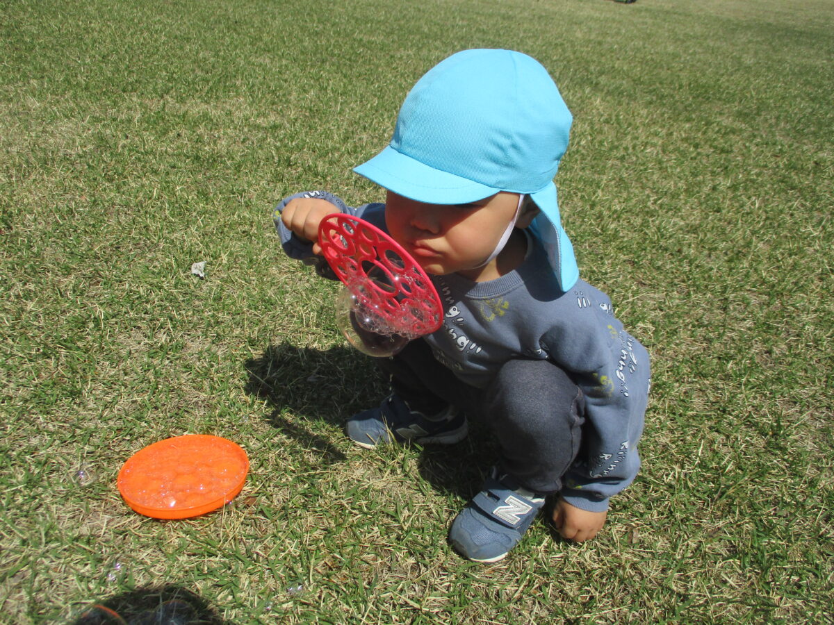 シャボン玉は大人気で、そーっと息を吹きかける子や、走ってたくさんシャボン玉が出てくる様子を楽しむ子と様々でした。