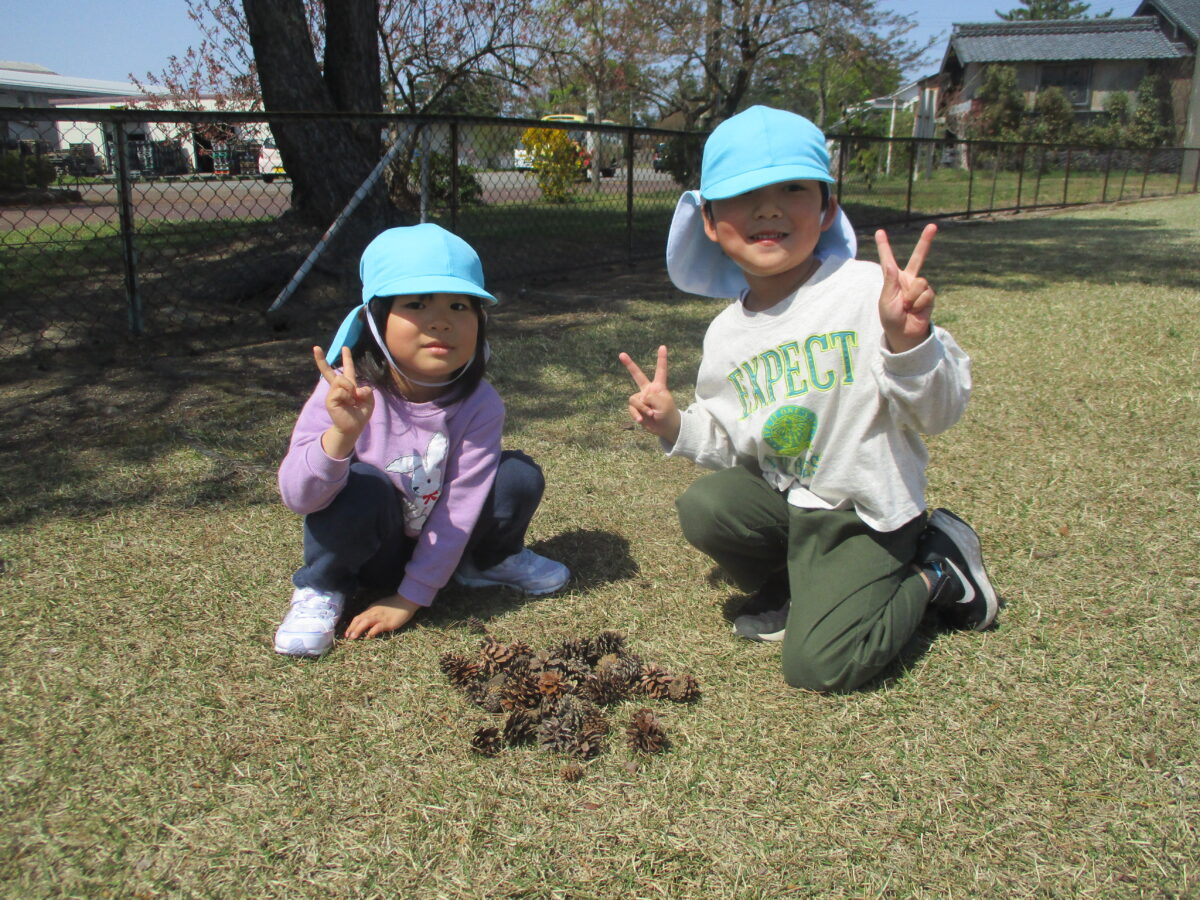 松ぼっくりをたくさん集めているお友達もいました!何に使うのか聞くと、「たき火をするから集めているんだよ」と教えてくれました。