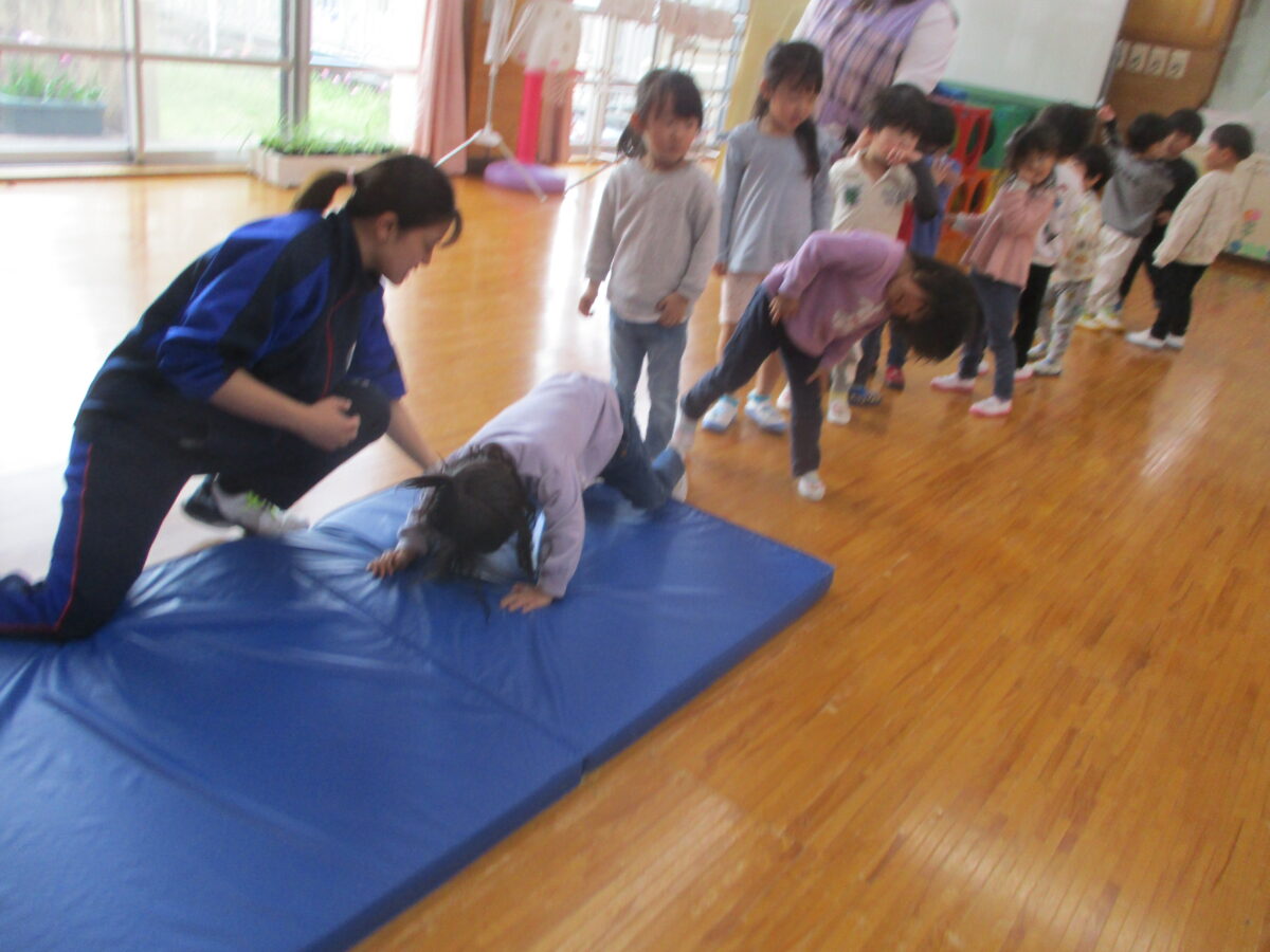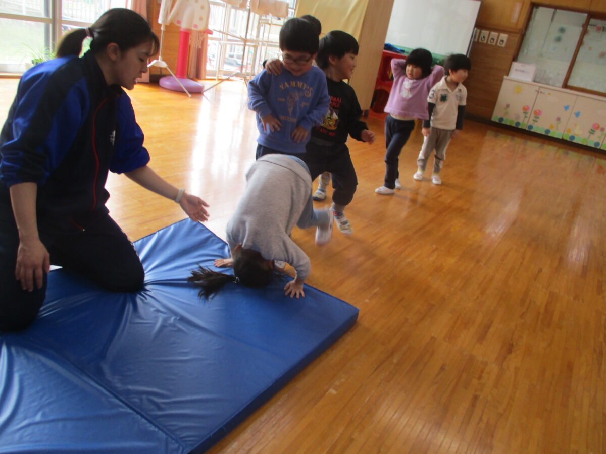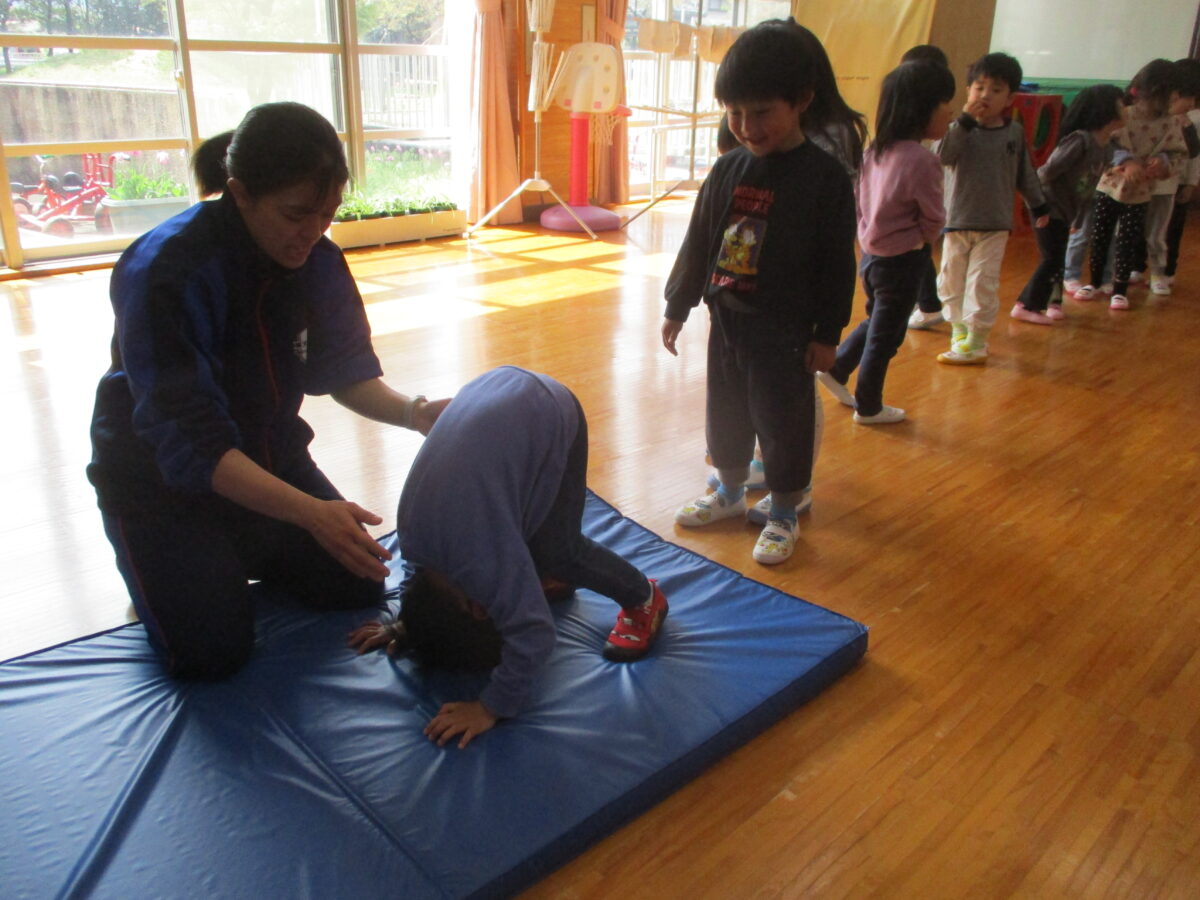 最後はでんぐり返しに挑戦です。講師の先生に支えてもらいながら、一生懸命挑戦していました。
