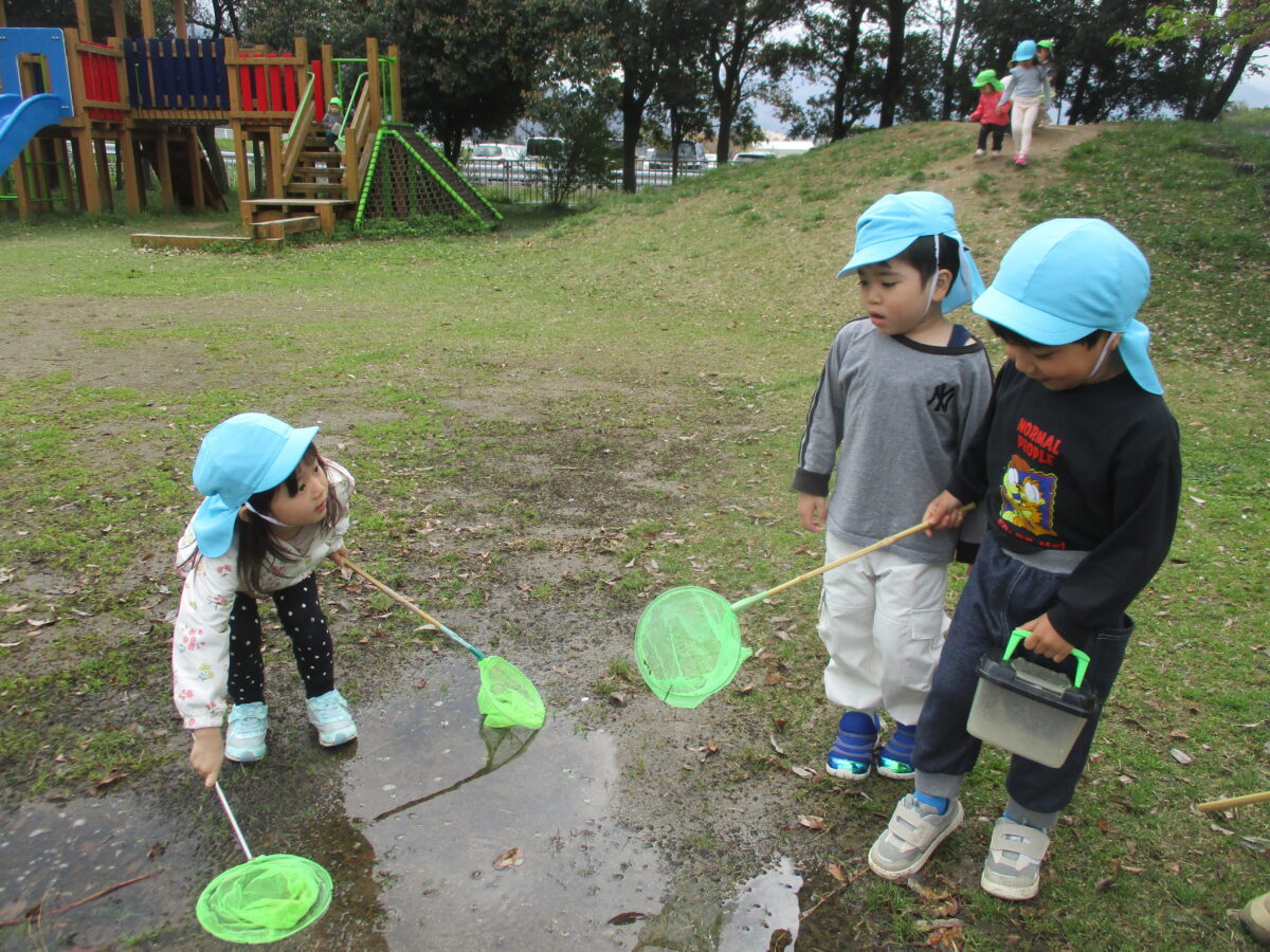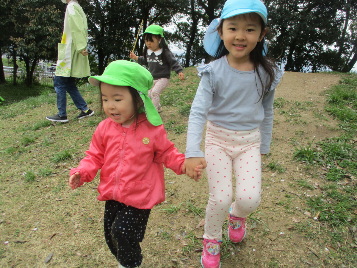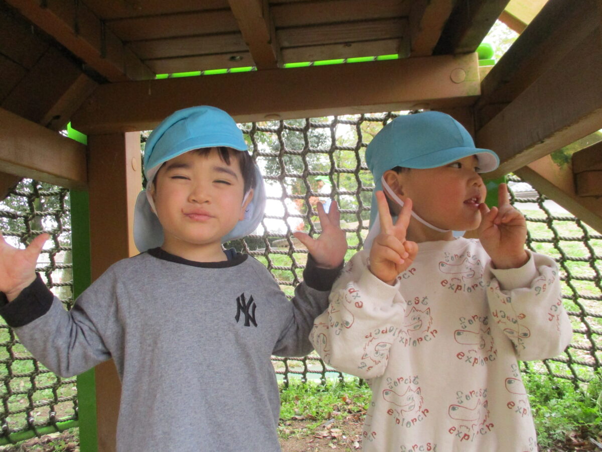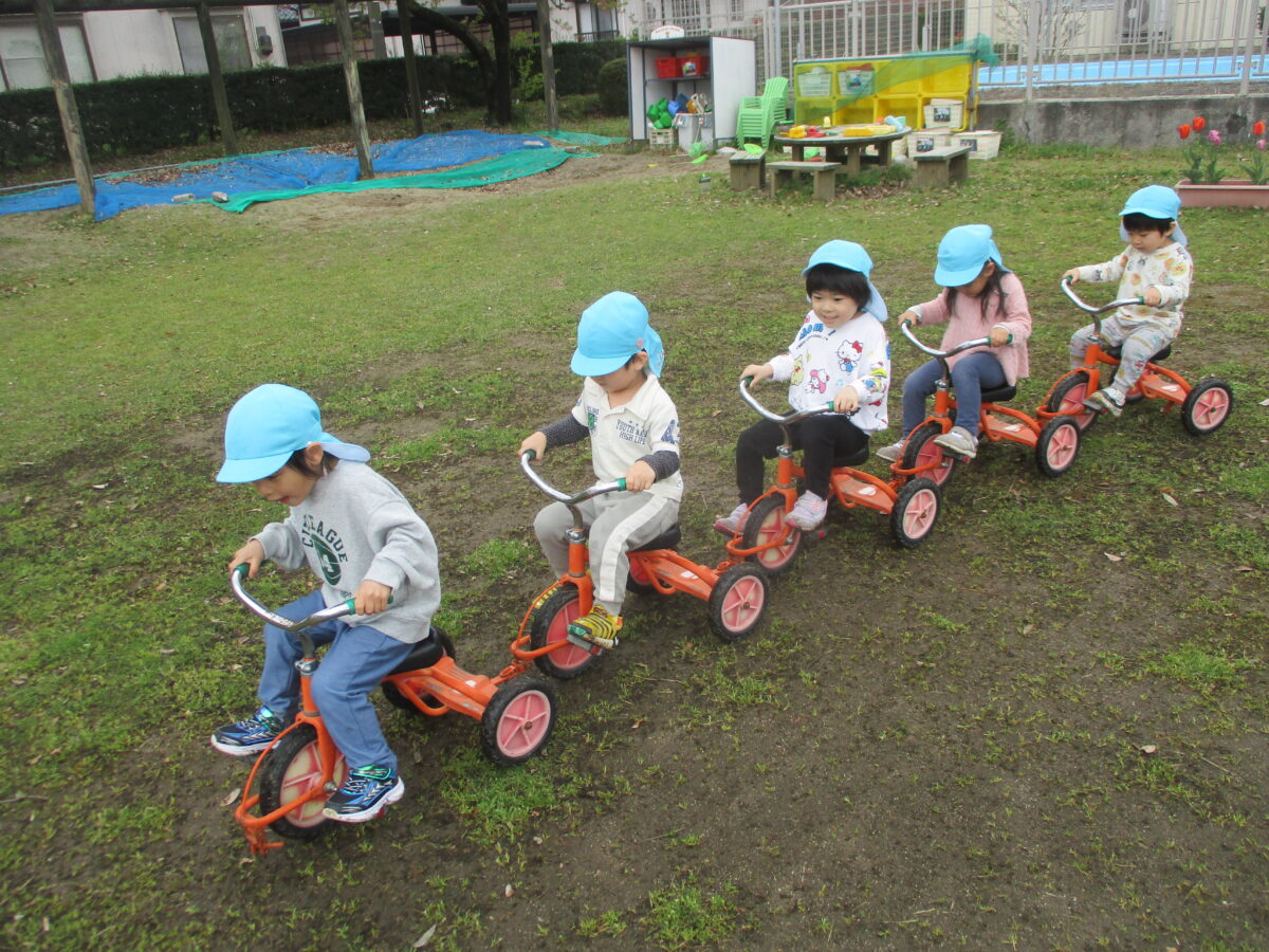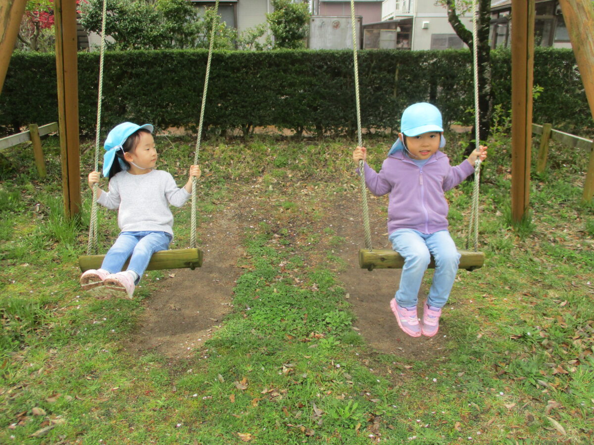 園庭でもたくさん遊ぶことが出来ています。暖かい気候の中、大型遊具や虫探し、ブランコや三輪車など好きな遊びを元気いっぱい楽しんでいますよ。