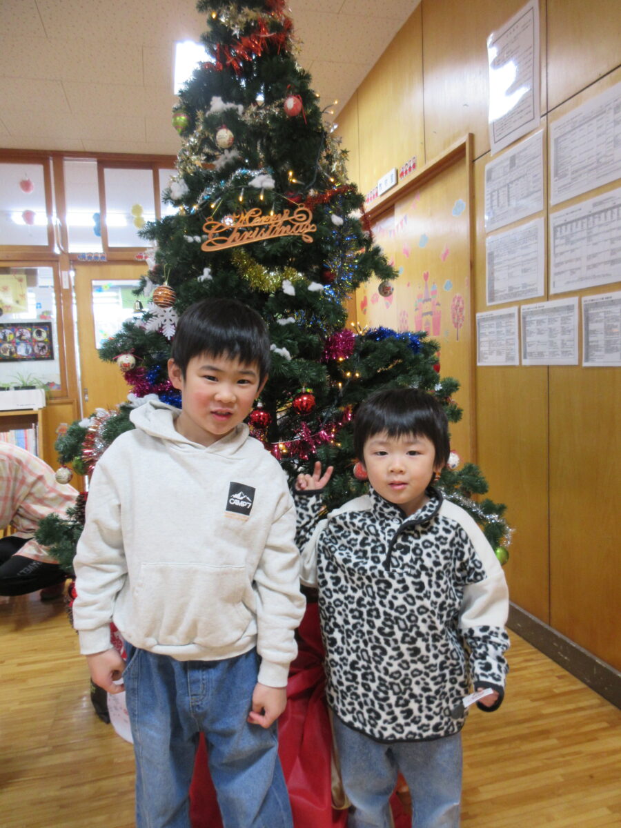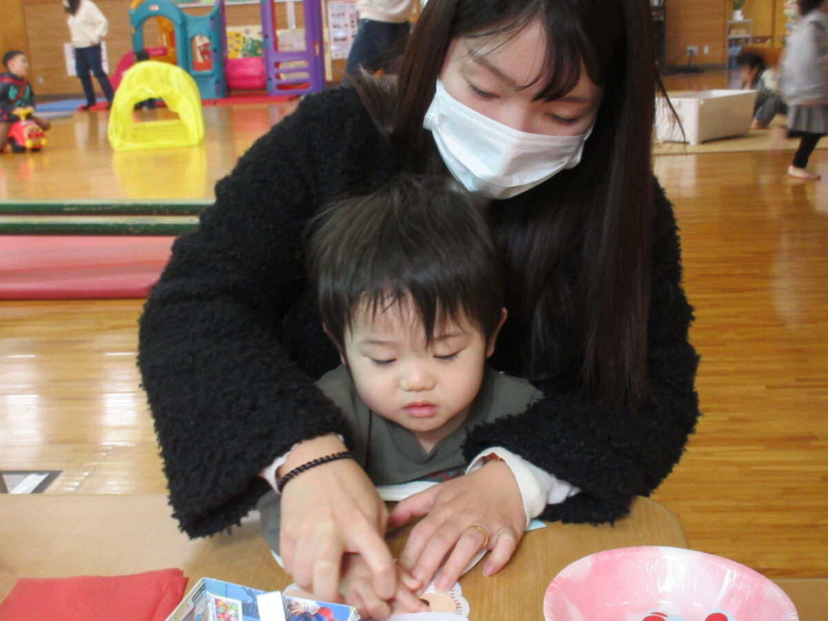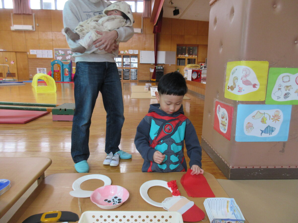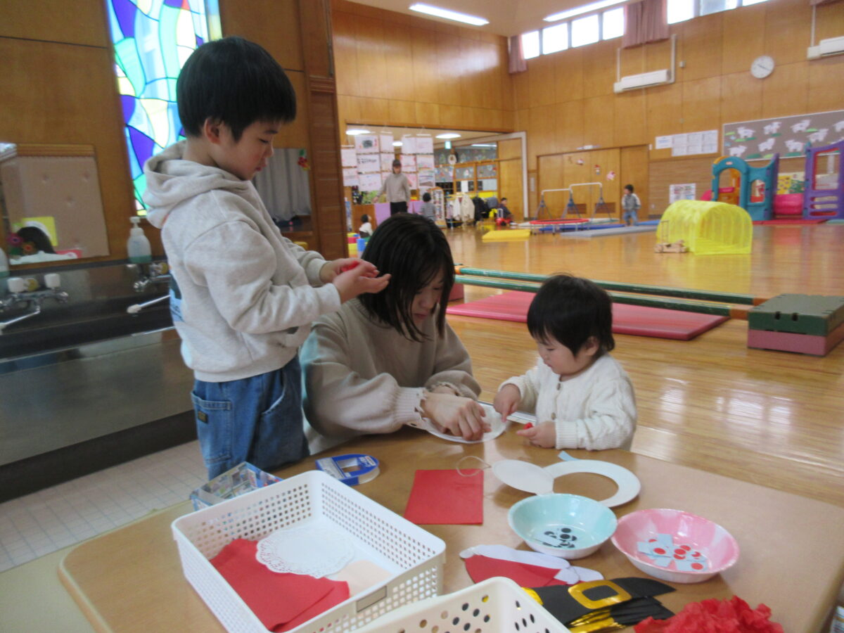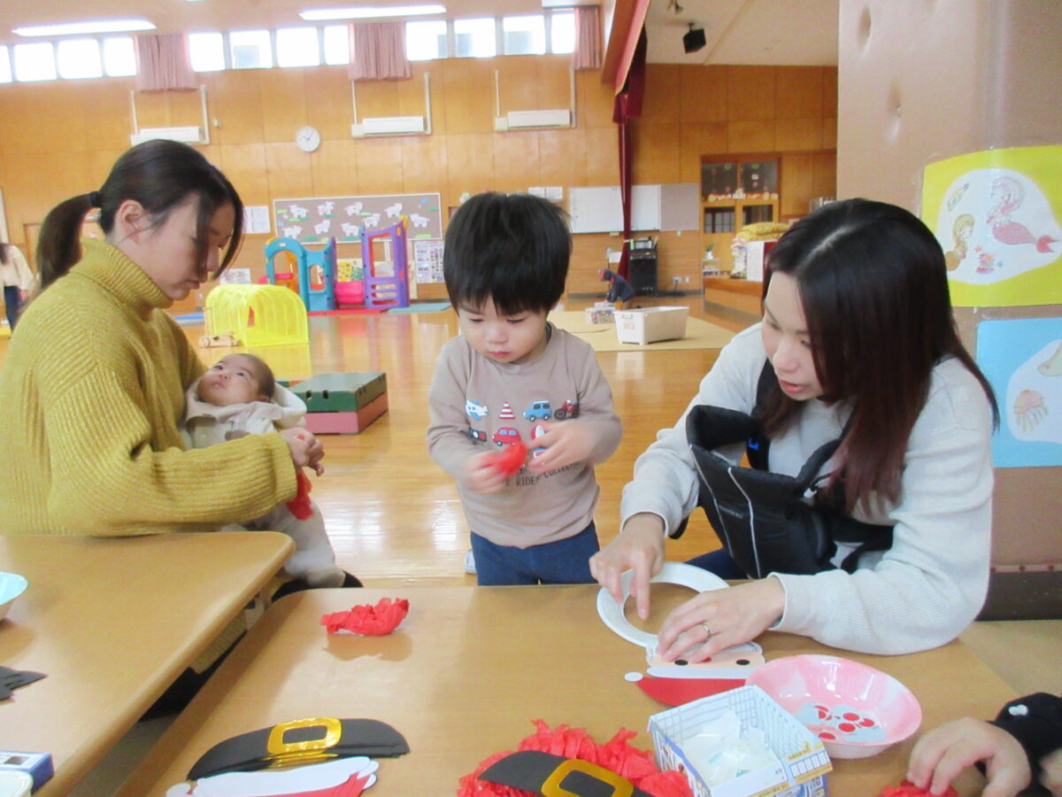 遊戯室ではからだを使う遊びの他に、製作コーナーで「サンタクロース作り」もしました。