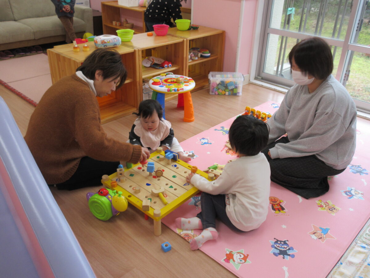 支援センターおひさまのお部屋では木の玩具やままごとでお友だちと一緒に遊んでいました。