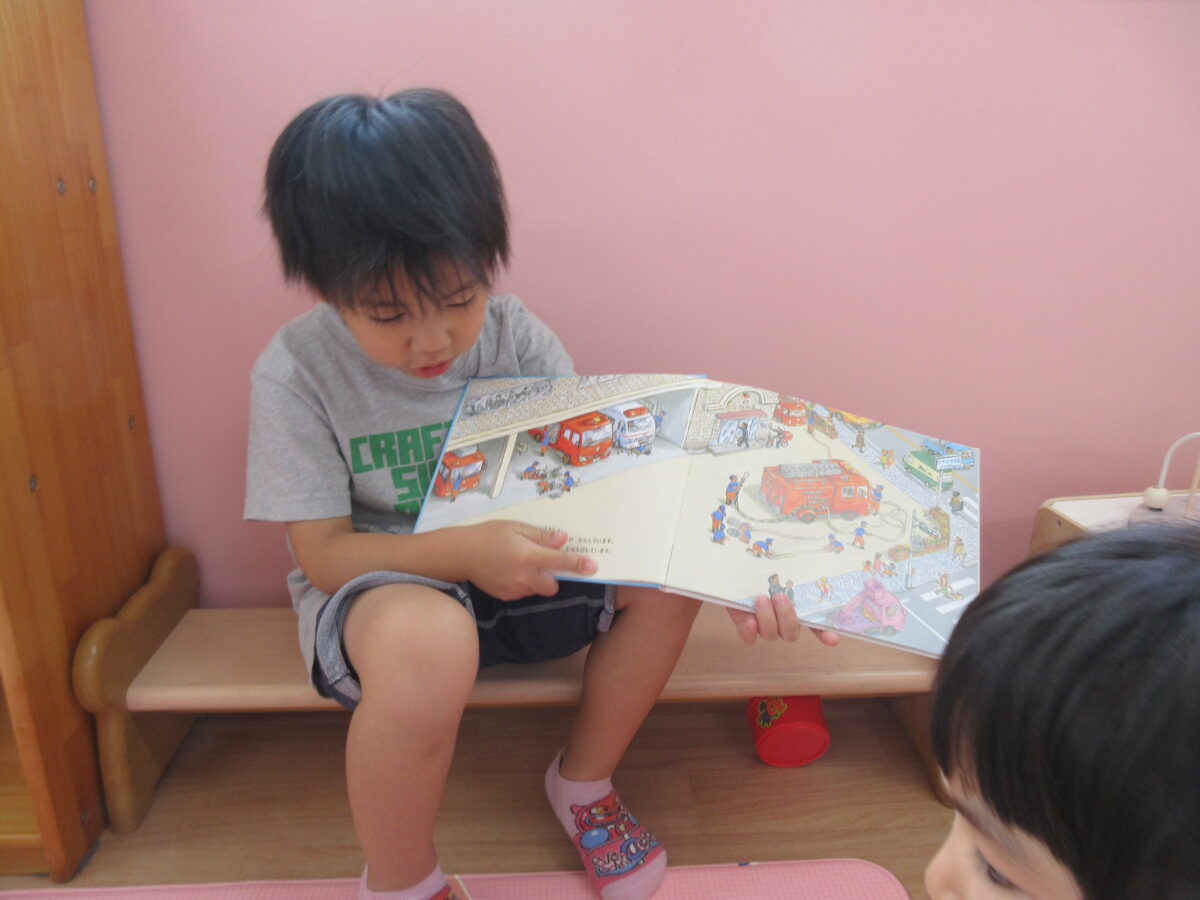 「おひさま」に遊びに来てくれたお友だちに、つき組さんが絵本の読み聞かせをしてくれています。