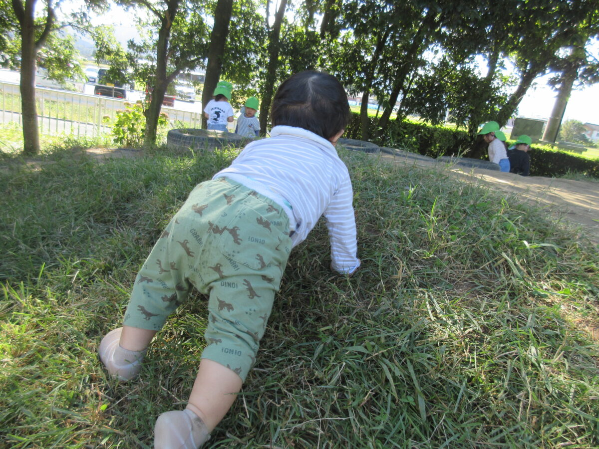 天気良い日は、こども園の園庭であそぶことができます。靴を履いて遊具や山のぼりを楽しんでいました。