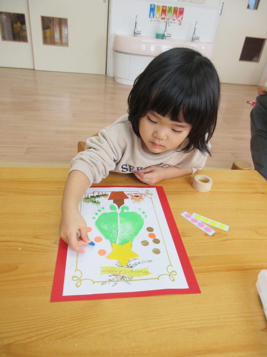 今日、明日は親子製作「足形ツリー」を行っています。午前8時45分~11時 午後2時20分~3時30分まで行っています。予約は不要です。時間内に来ていただければ大丈夫です。かわいいツリーを作りましょう。お待ちしています。