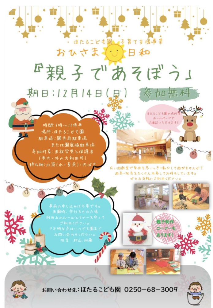 12月14日(日)に「おひさま日和!親子であそぼう」を行います。たくさんのお友だち、お家の方に会えるのを楽しみにしています。
