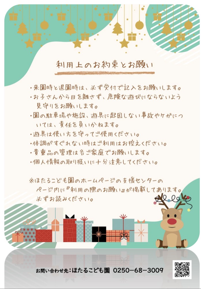 ◎HPの子育て支援センター「おひさま」のページの【支援センターからのおたより】の「おひさま日和!親子であそぼう!」に利用上のお願いが詳しく記載されておりますのでご確認をお願いいたします。