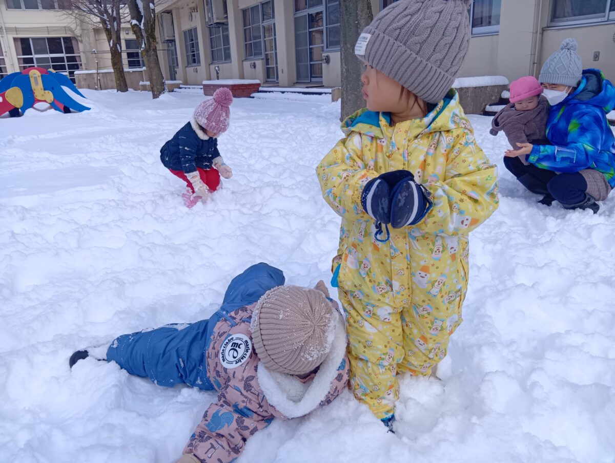 今日も園庭にはふわふわ、サラサラの雪がたーくさん!!足跡がないところはズボッ!ズボッ!となり、歩くだけでもアスレチックのように楽しいです♪